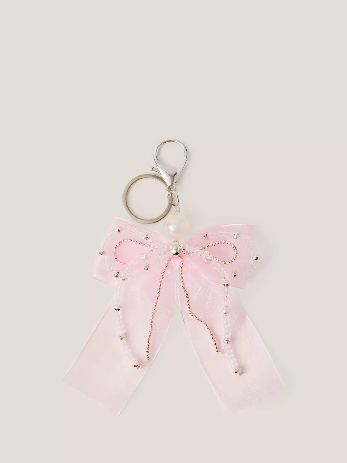 For little ones who love to accessorise everything. This bag charm features beaded and pink ribbon bows, dangling from a silver-tone key ring and dog clip fastening.
