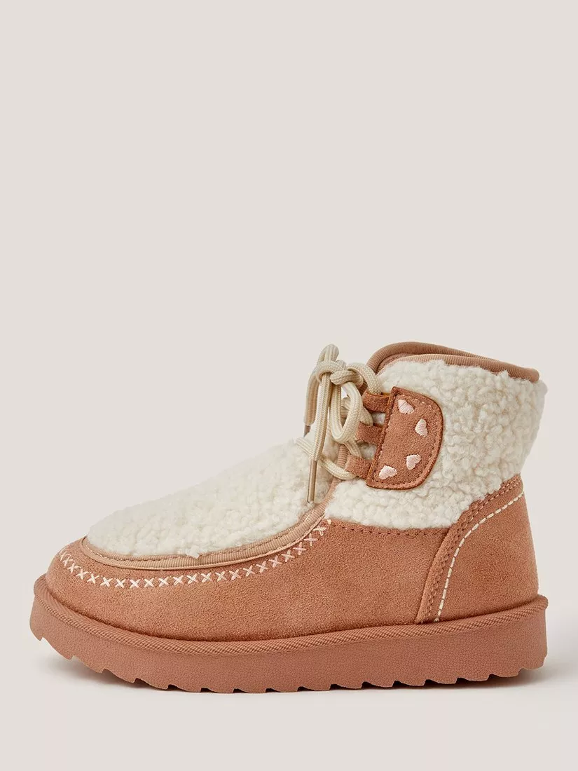 Keeping their toes toasty warm, these boots are designed in soft suedette and faux shearling with cross stitching and heart embroidery as decoration. Finished with easy lace-up fastenings and a ridged flatform sole.