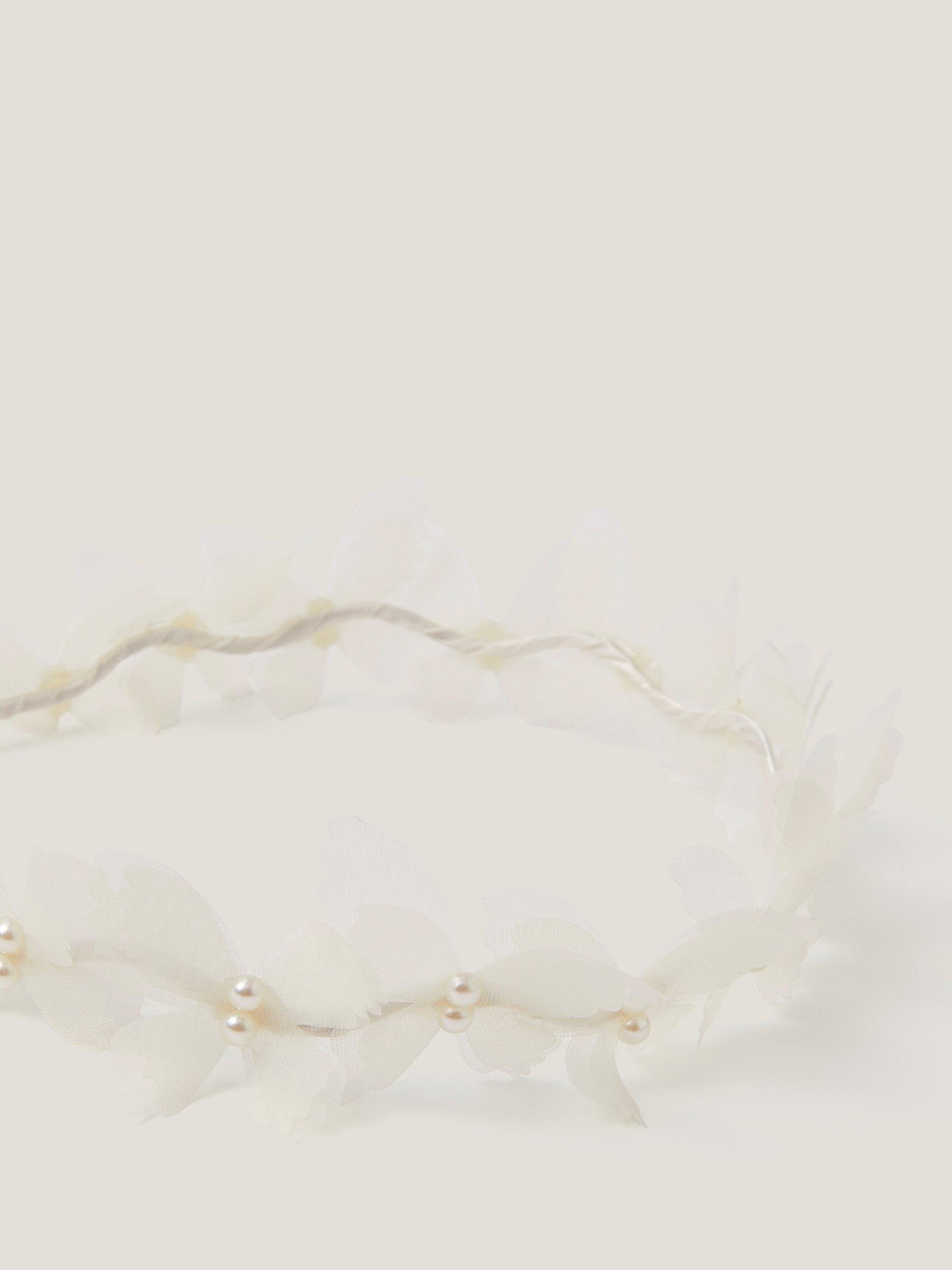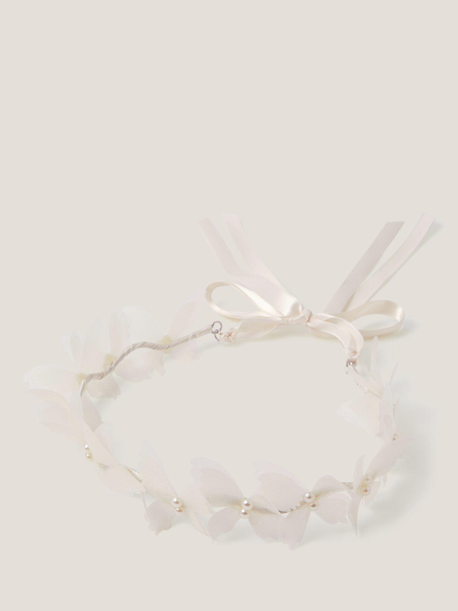 Move aside tiara, the flower crown is having its moment. Designed with a wiggly metal frame, it's decorated with fluttery fabric butterflies and pearl beads with a ribbon bow fastening at the back.