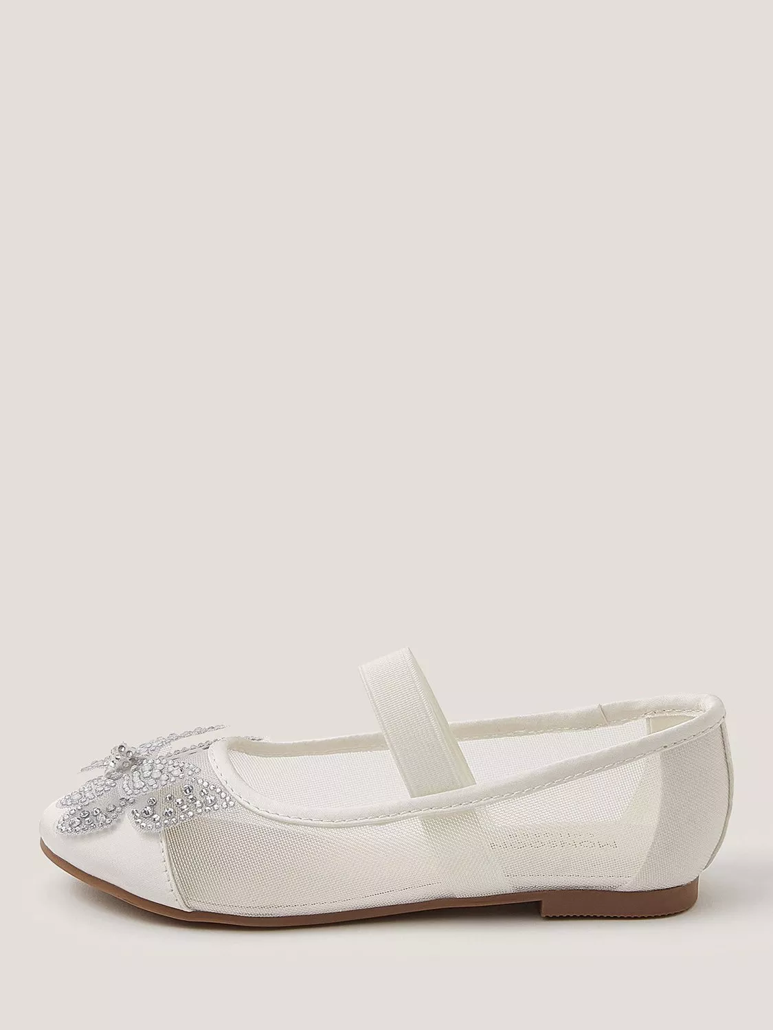 Perfect for their next fairytale occasion, these ballerina flats showcase a rhinestone-embellished butterfly at the toes for statement sparkle. Designed with a mesh outer, they secure over the foot with a soft elasticated strap.