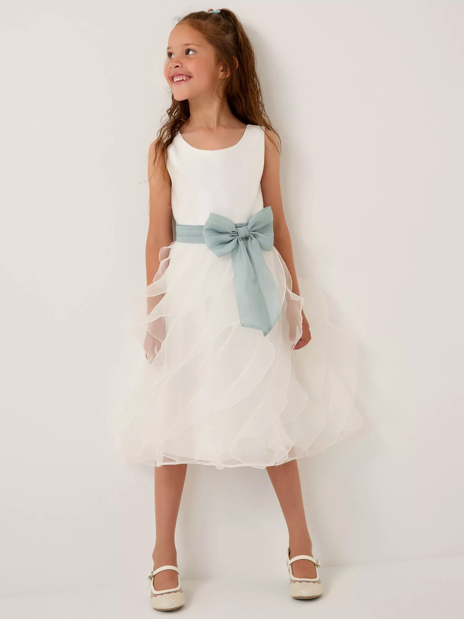 A real winner for special occasions, this Monsoon dress is designed with a sleeveless bodice, cascading ruffle skirt and big bow belt around the waist.