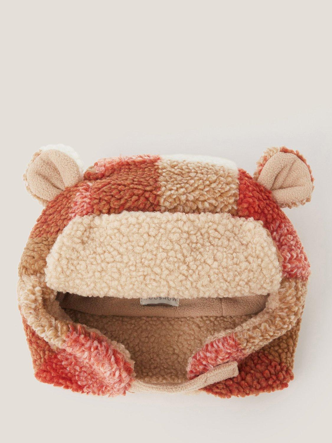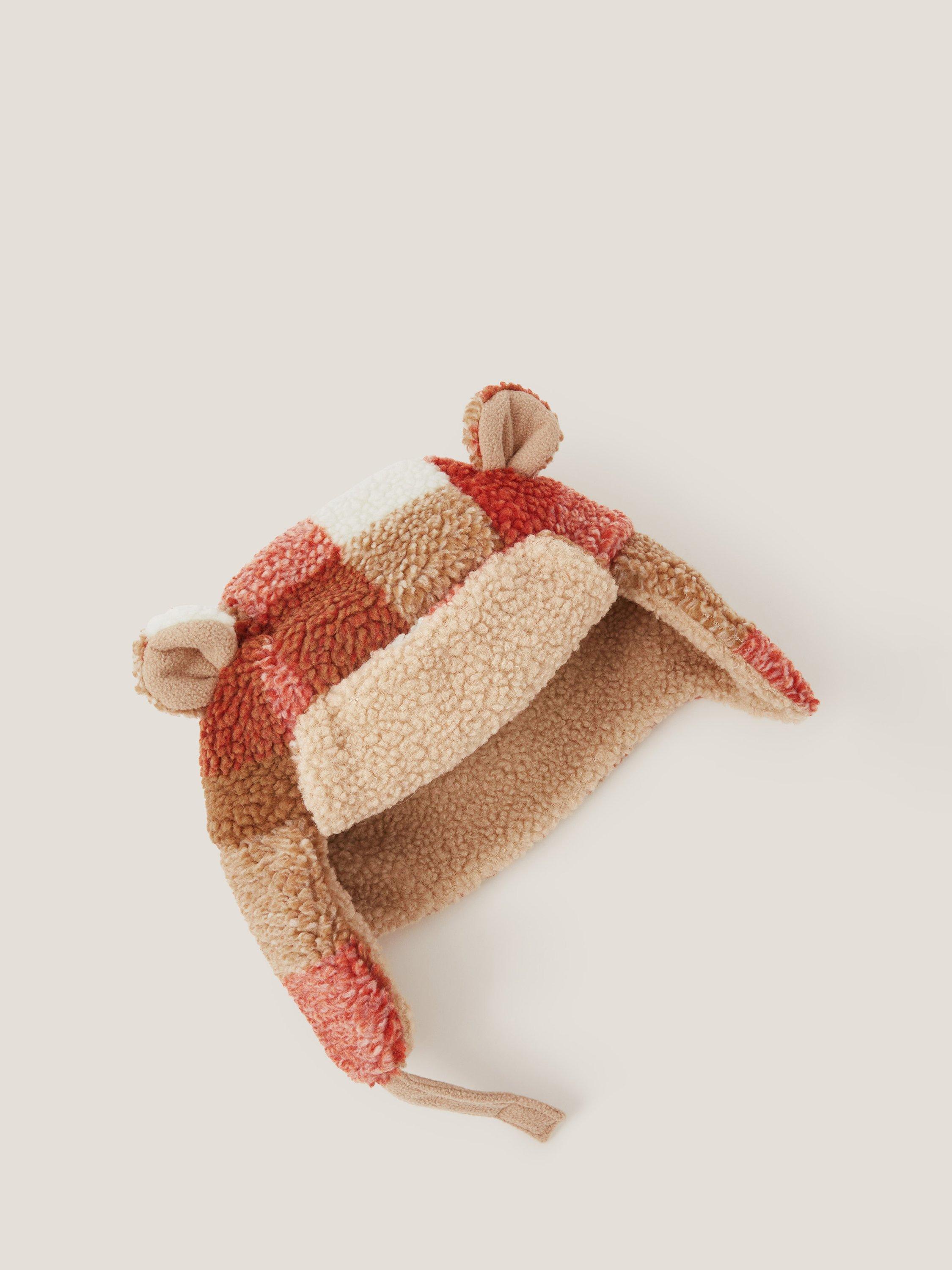 The coolest type of ear-warmers, this trapper hat is made from snuggly soft borg with a bold checked pattern. Finished with a rip-tape fastening under the chin and teddy ears on top.