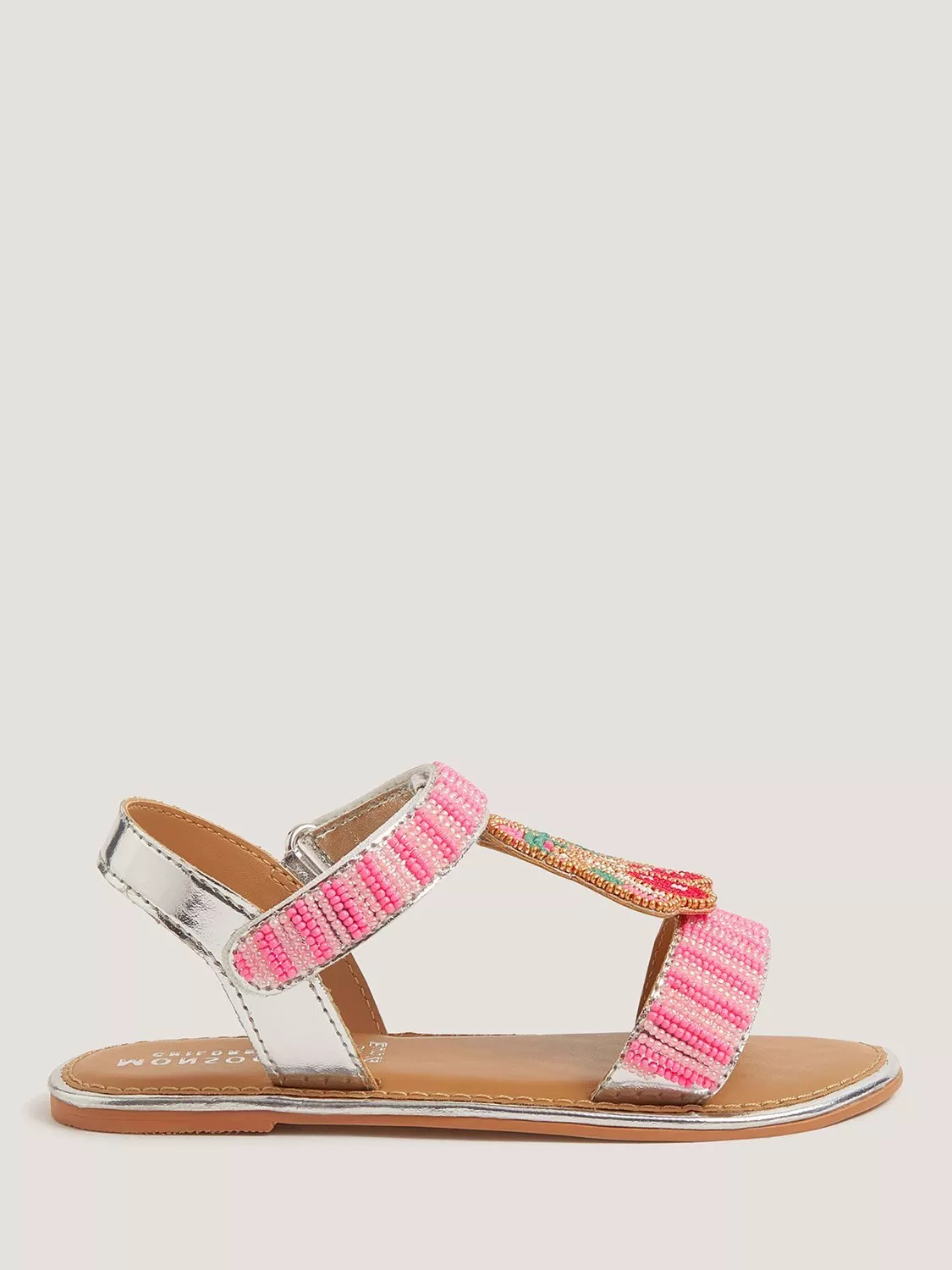 Metallic straps wrap the foot for an airy feel in these Monsoon strappy sandals, designed for everyday comfort with a playful twist. The lightweight sole supports each step, while the embellished cherry gives a sweet touch for versatile summer dressing.