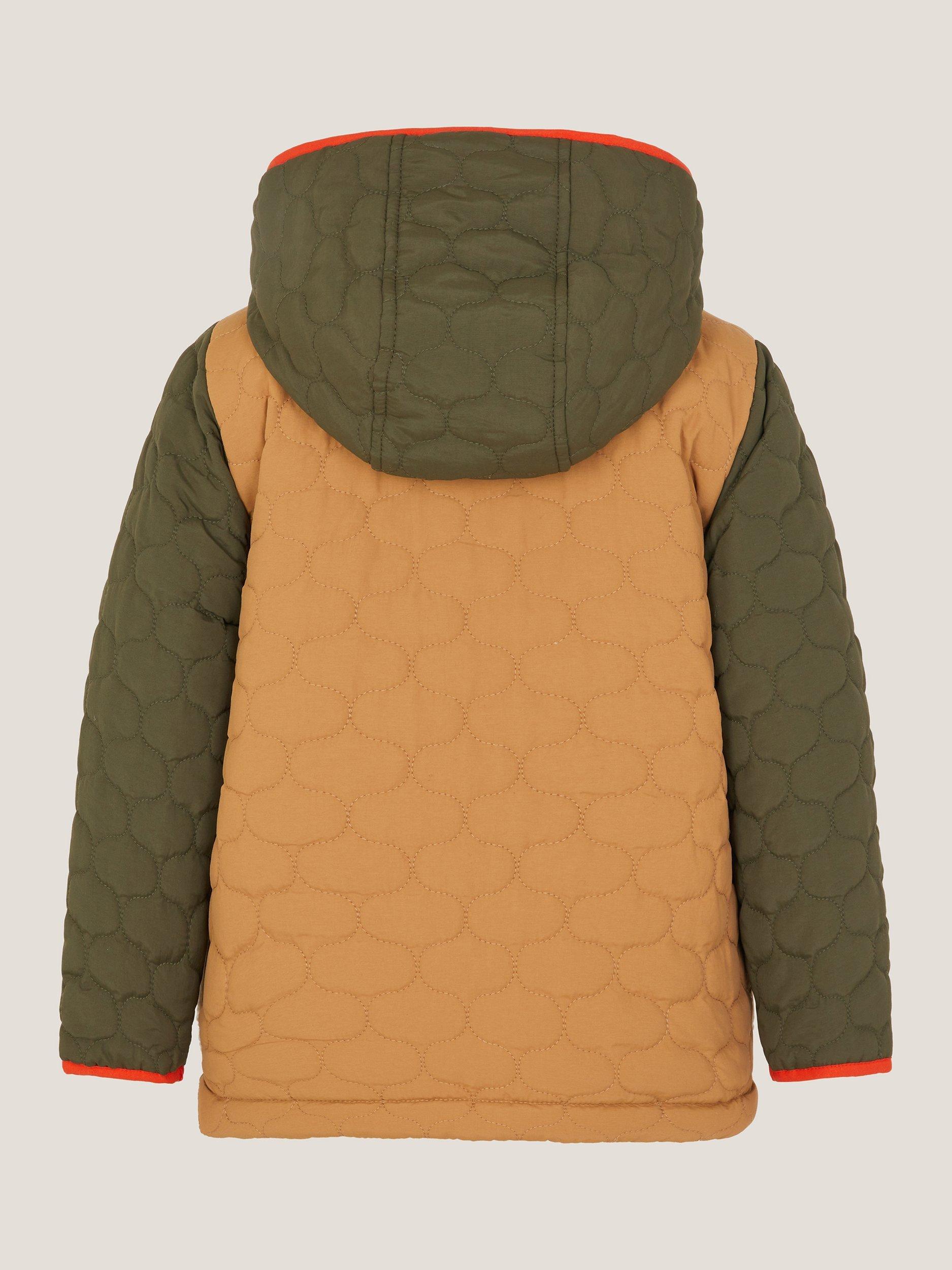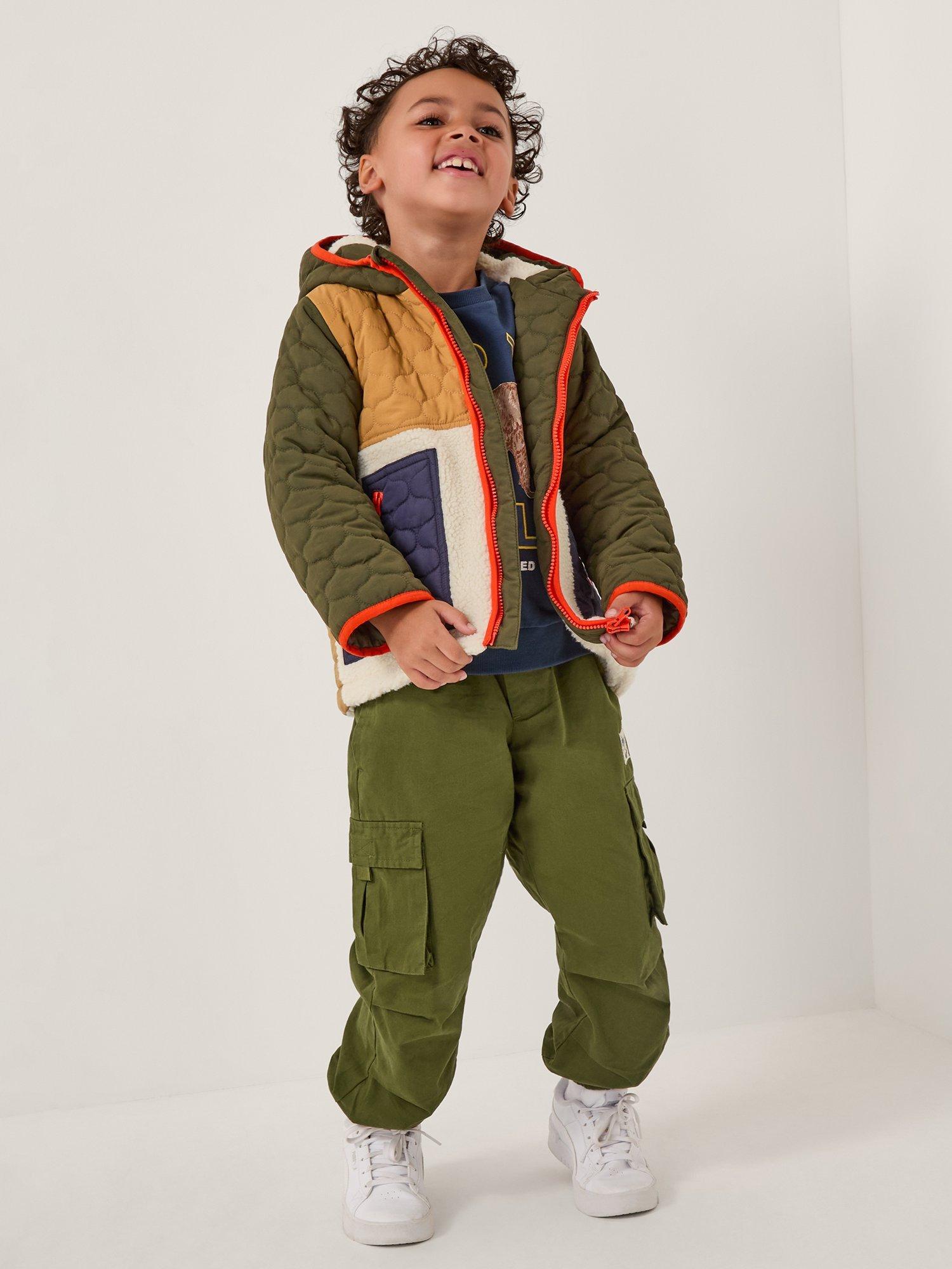 They're going to live in this. Perfect for park trips or weekend hangs with their mates, this hooded jacket is designed with quilted stitching and soft borg lining to match the panels by the zip pockets. Finished with a zip fastening and varsity-inspired patch at the chest.
