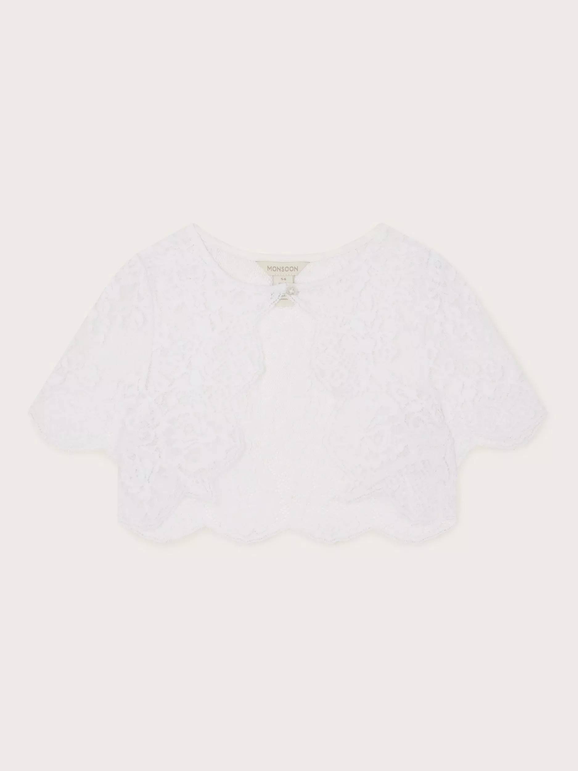 This cropped cardigan is crafted in floral lace with a scalloped finish. It's a perfect layer to style over sleeveless occasion dresses and it fastens at the front with a single button.