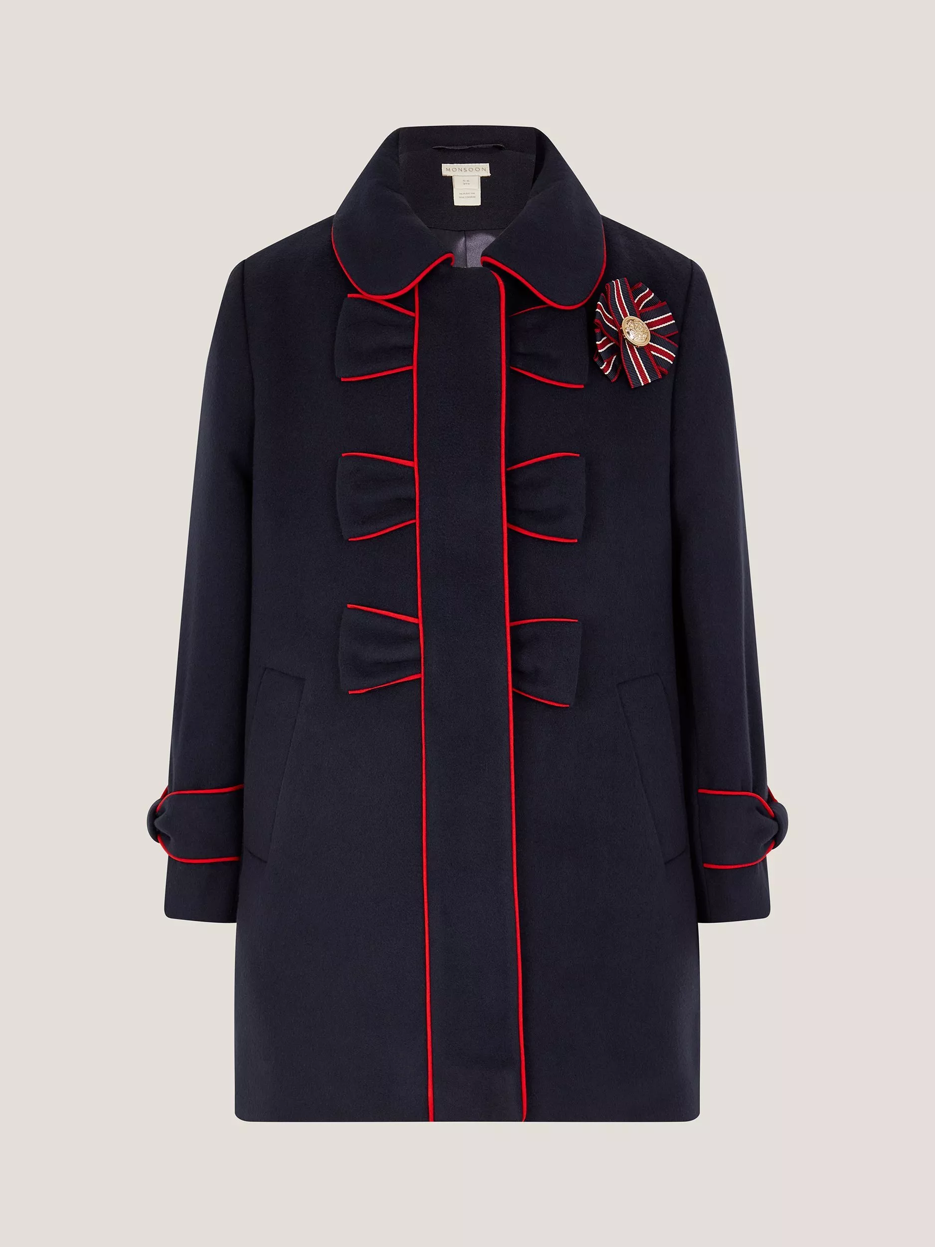 A charming coat from Monsoon, designed with a concealed button fastening and side pockets. Finished with contrast piping to the front and cuffs, and a rosette bow for a refined look.