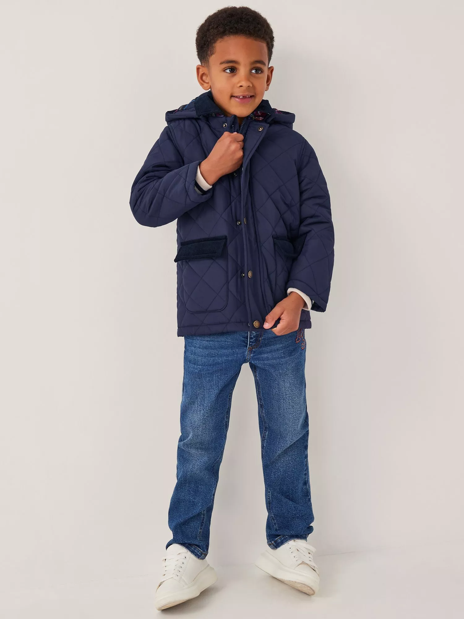 All bundled up. Perfect for the school run, this quilted jacket features a corduroy collar and pocket details. Complete with a hood and snap button fastenings through the front.