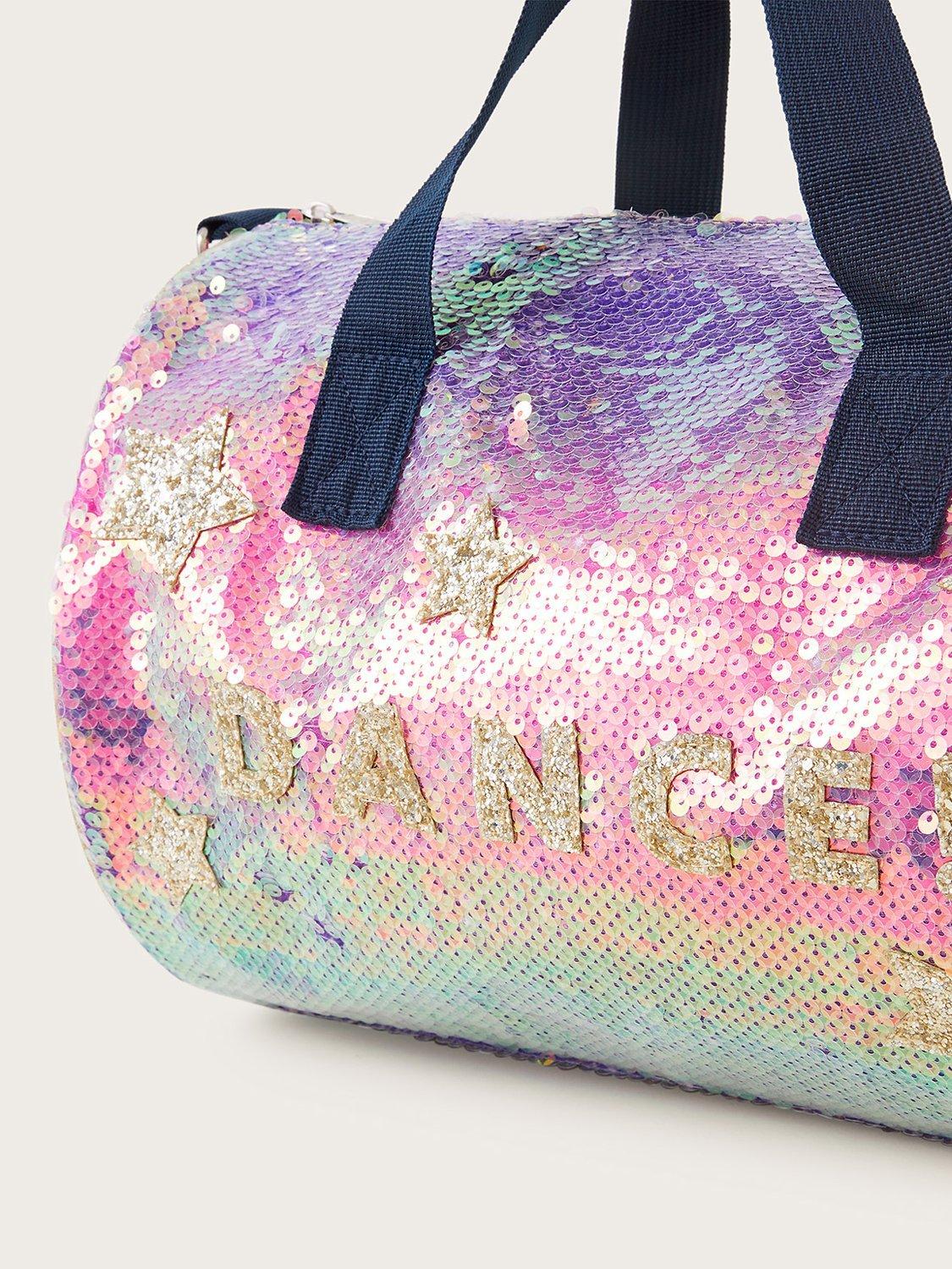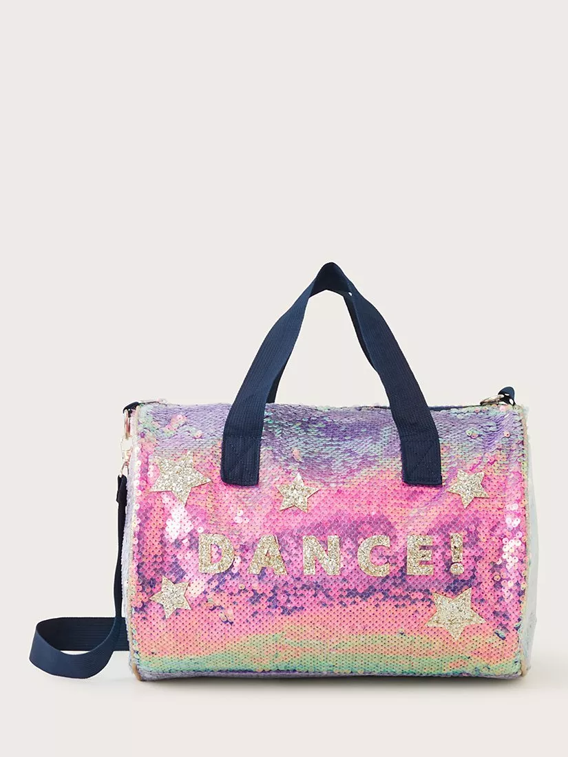 Keep your costume, shoes and water bottle in this sparkly dance bag. Coated in sequins, it reads 'DANCE' on the front, with grab handles and a longer shoulder strap for carrying.