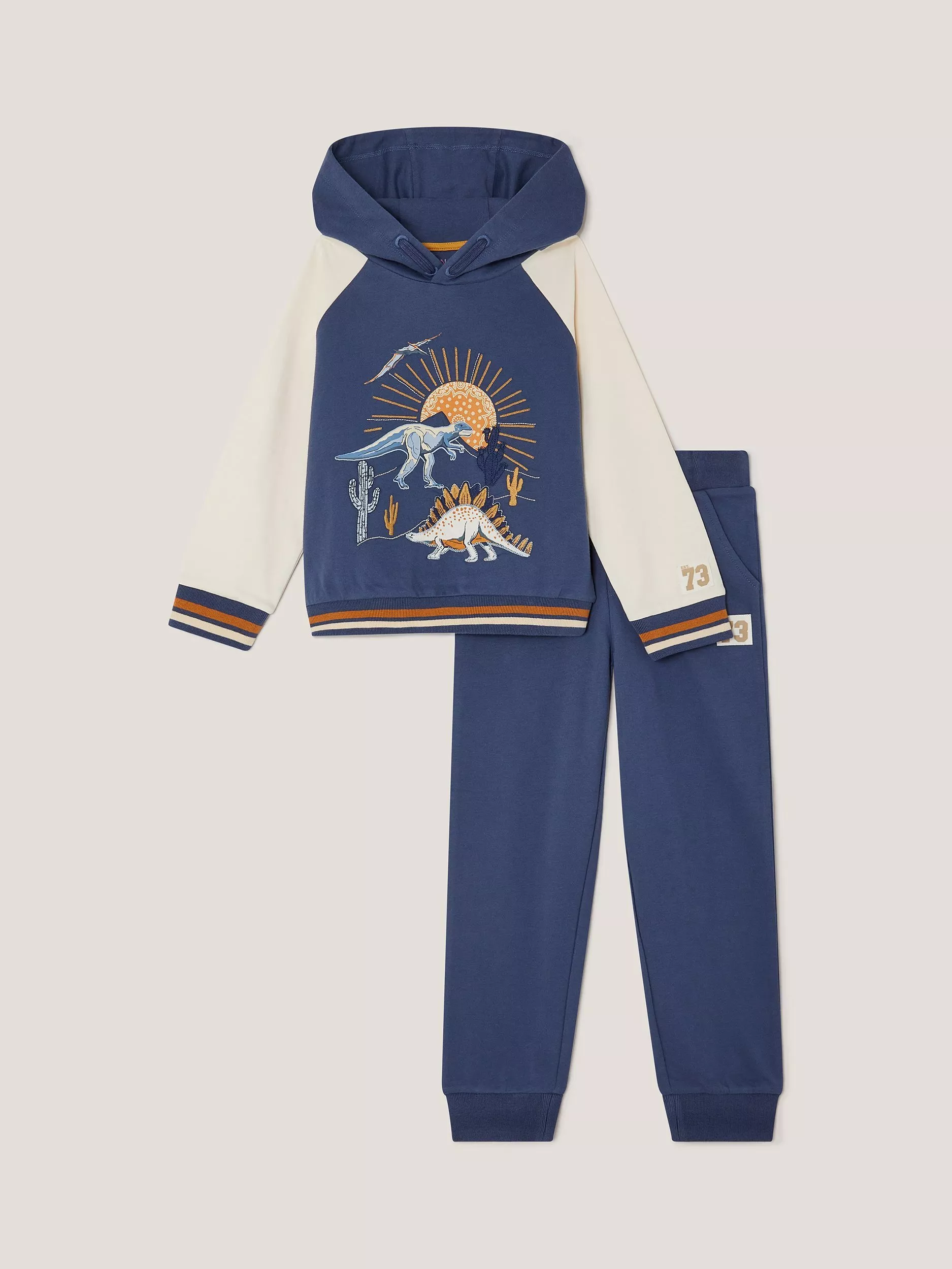 Roar-some (and comfortable.) Comprising a super-cosy hoodie and matching trousers, this set boasts a varsity style with dinosaurs to the front. Weekend, here we come!