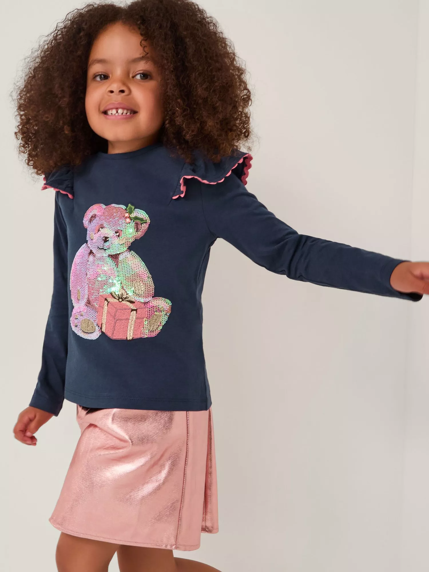 Get your little one excited for Christmas by adding this top to their December outfit rotation. Made from soft cotton in navy blue, it's decorated with frilly shoulders and a sequin teddy bear sitting with a perfectly-wrapped present.