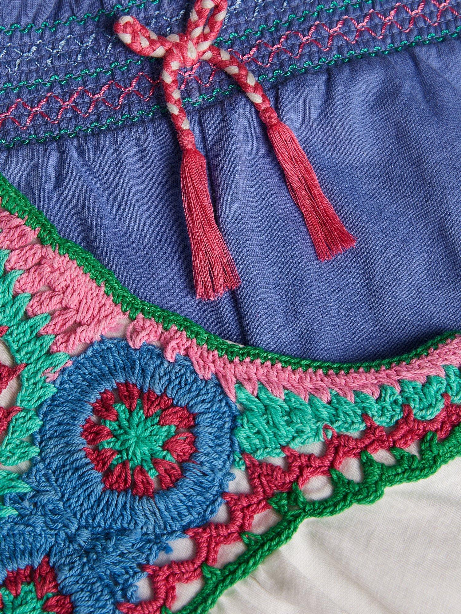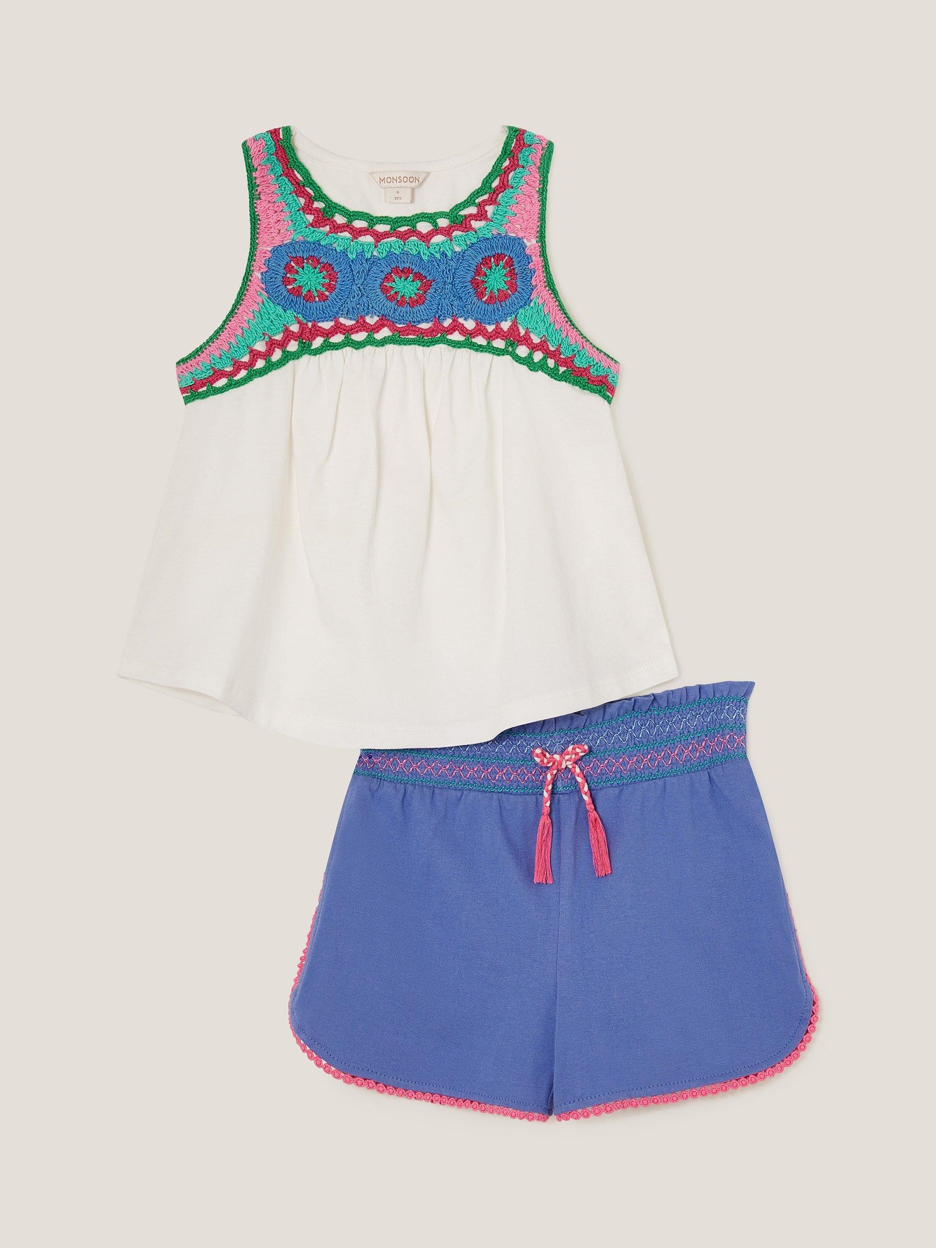 For every sunny adventure. An easy-peasy beach outfit they can wear on the next family holiday, this set includes a cotton vest with colourful crochet details around the neckline, and blue comfy stretch-waist shorts to match.