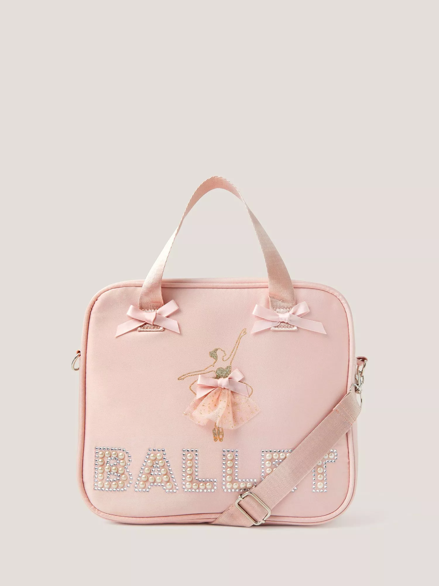 The perfect pick for carrying all their dance class essentials, this bag is made in slipper pink satin with a bedazzled ballet design on the front. Features a main zip compartment, two top handles and an adjustable strap to style across the body.
