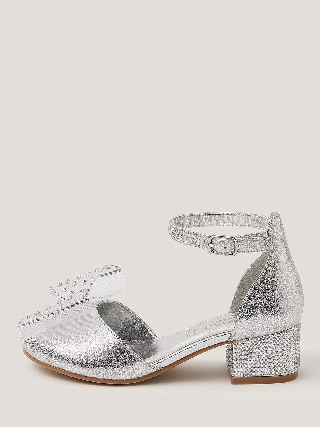 Designed in a metallic finish, these party heels are complemented by a sparkly bow on the toe and diamantés on the buckle fastening and heel.