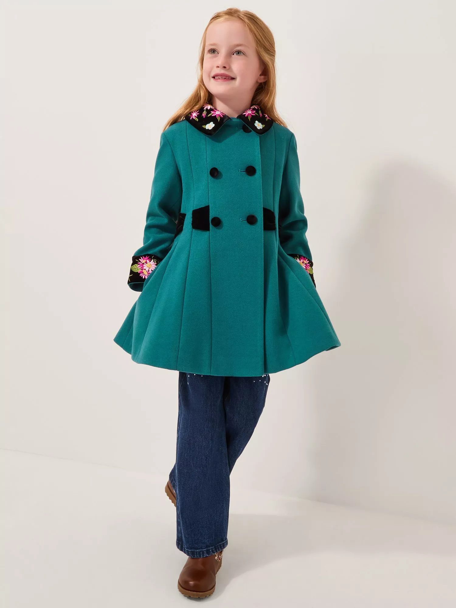 A standout addition to their winter wardrobe, this coat is designed in a striking teal hue with contrasting velvet accents and floral embroidery to finish. Complete with double-breasted buttons to the front.