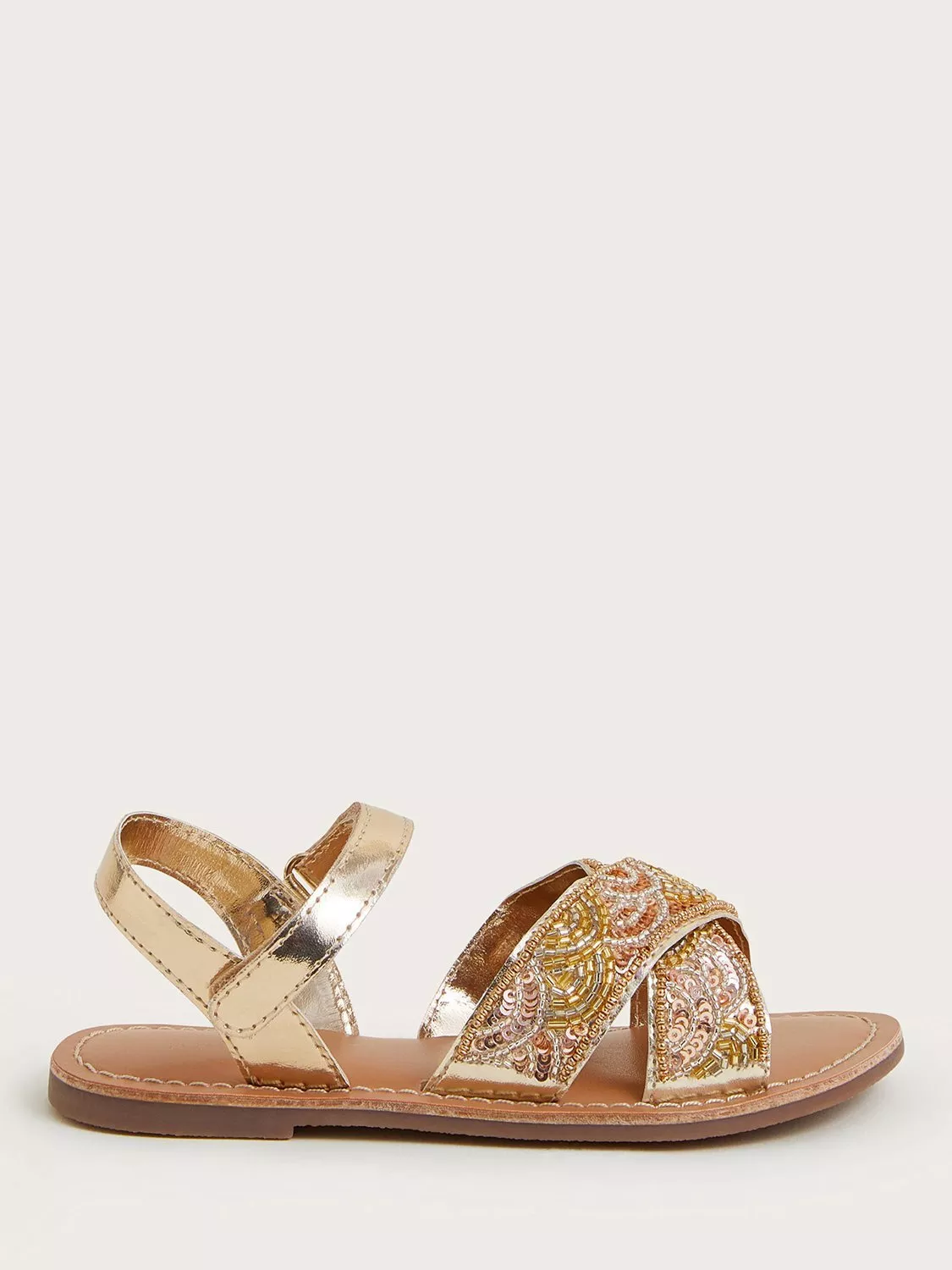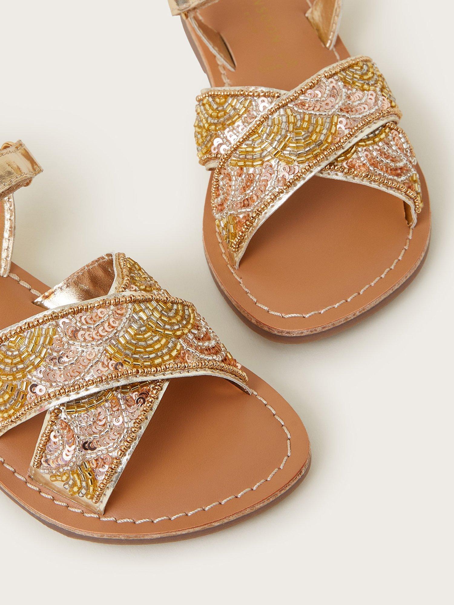 This way to the beach! Featuring golden beaded embellishments, these sandals make floaty summer dresses pop. Finished with gold faux leather straps that fasten with rip tape.
