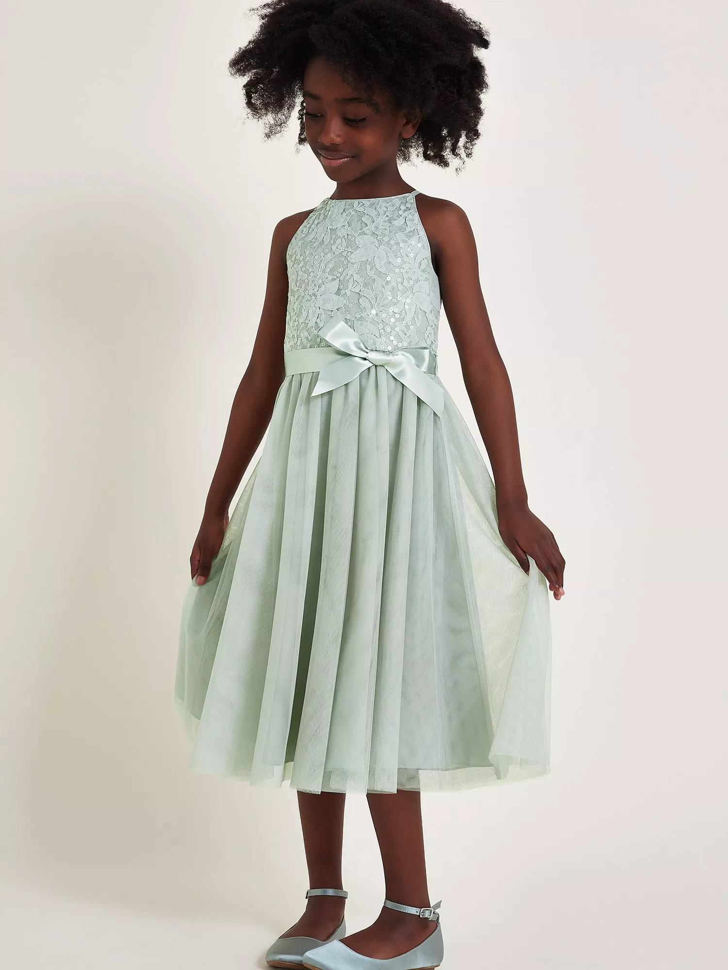 Year-round special occasion dress with a bodice featuring shimmering embroidered lace and a sleek satin bow to the waist. It's super comfortable, with plenty of room for dancing, thanks to the lighter-than-air tulle skirt.