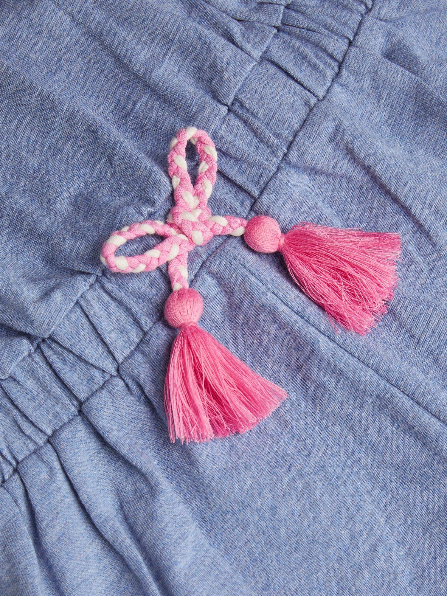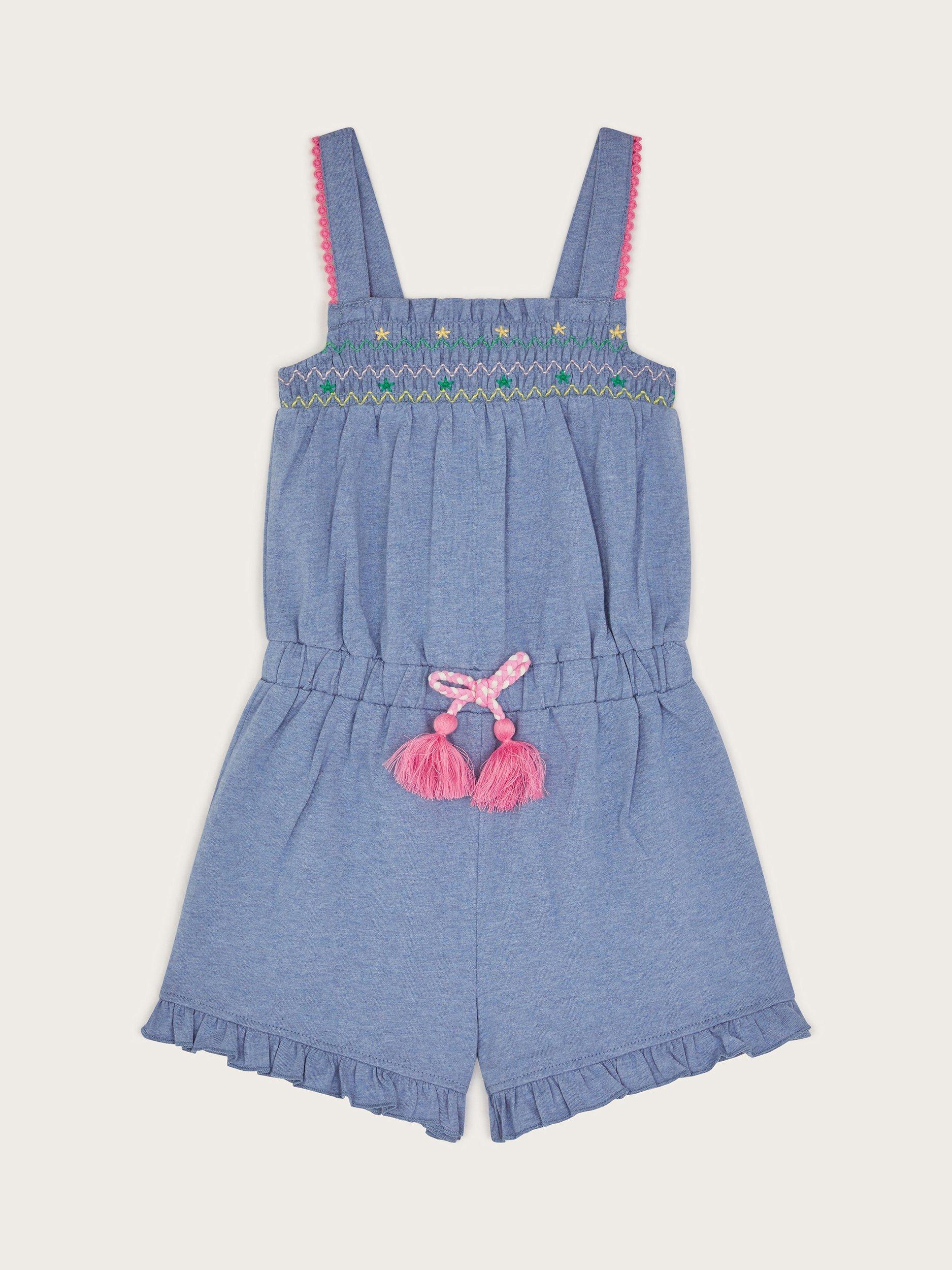 Easy-peasy summer outfitting, perfect for beach trips or the family holiday. This playsuit is made in a soft marl fabric and decorated with colourful embroidery over the smocked neckline. Finished with a tassel-cord waist.