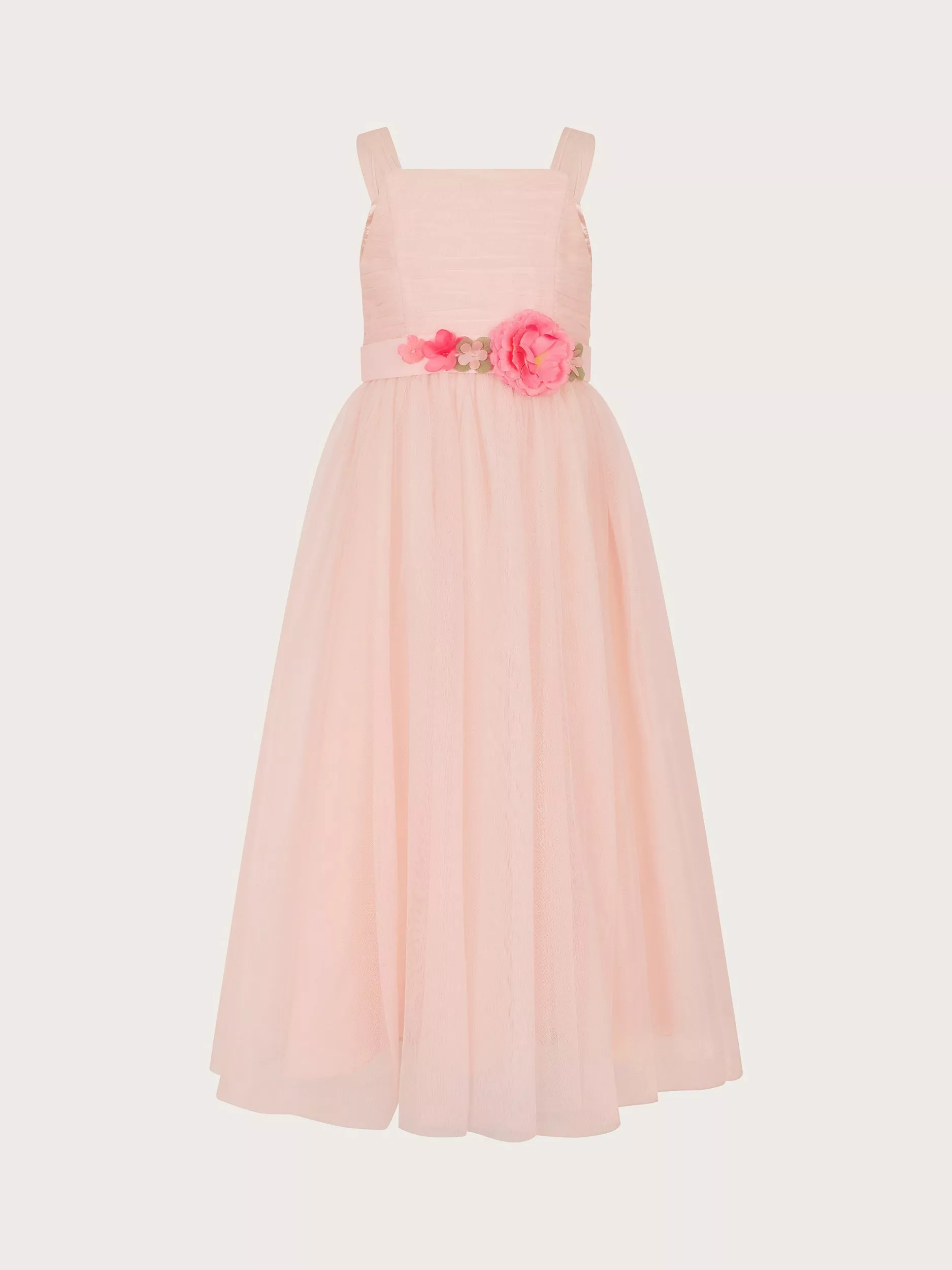 Made from elegant tulle, this dress is designed with a fitted bodice and features a belt with statement fabric flower detail. It falls to a maxi length, making it an ideal style to swish and show off at every special event.