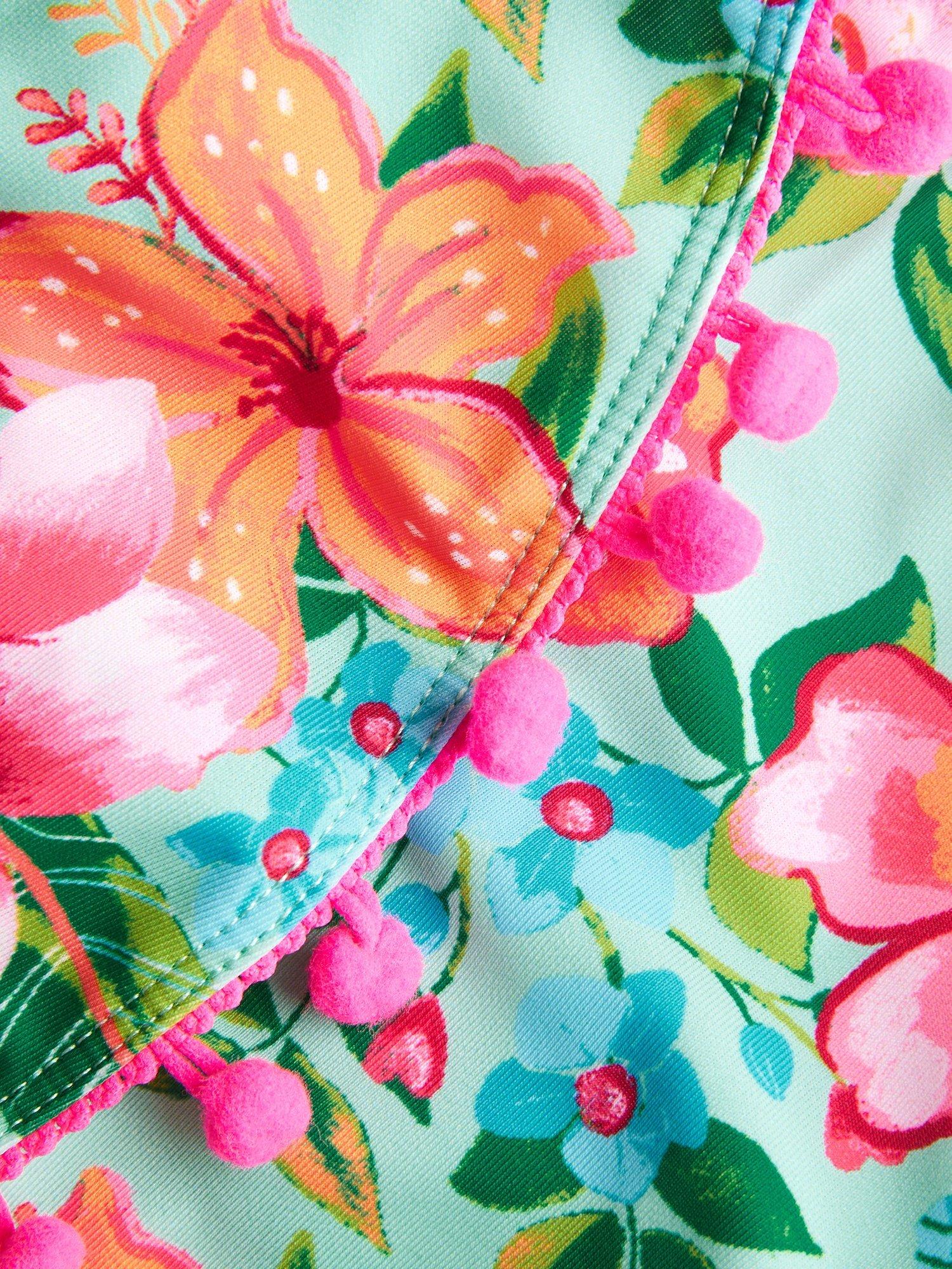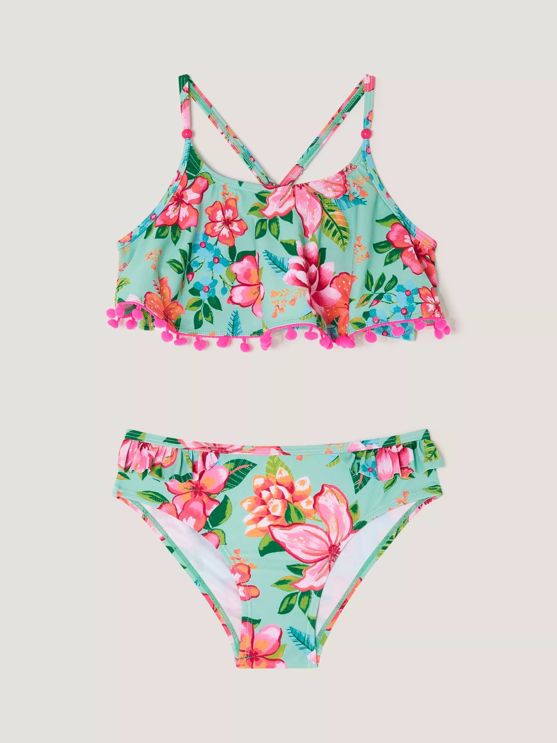Printed with tropical flowers, this bikini set is designed with frilly detailing and a vibrant pom-pom trim.