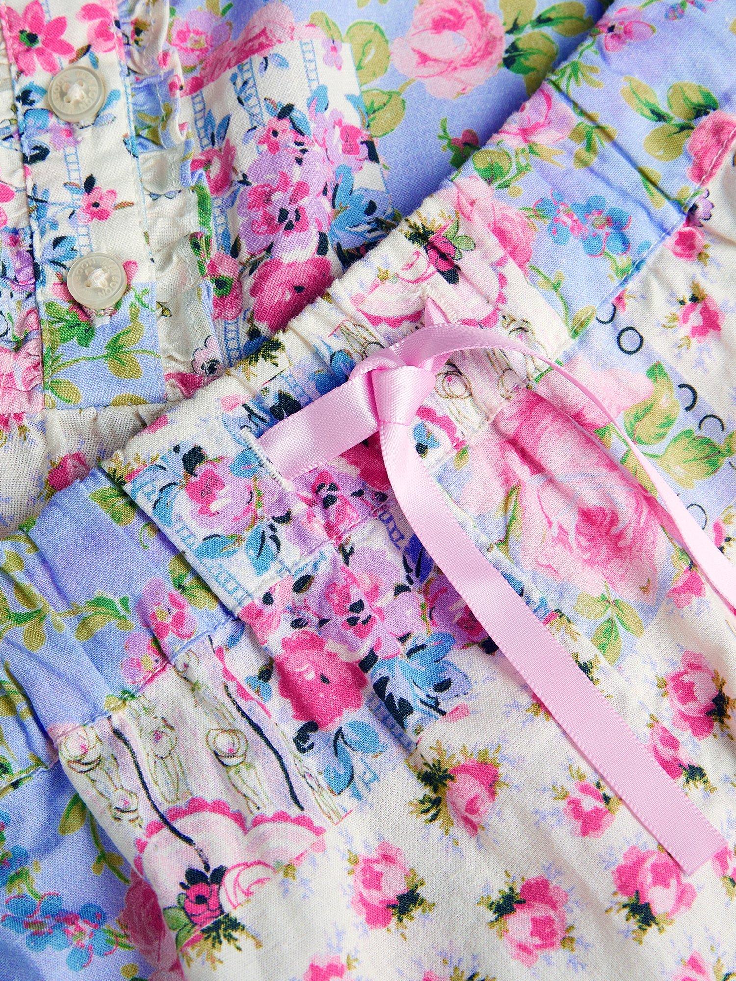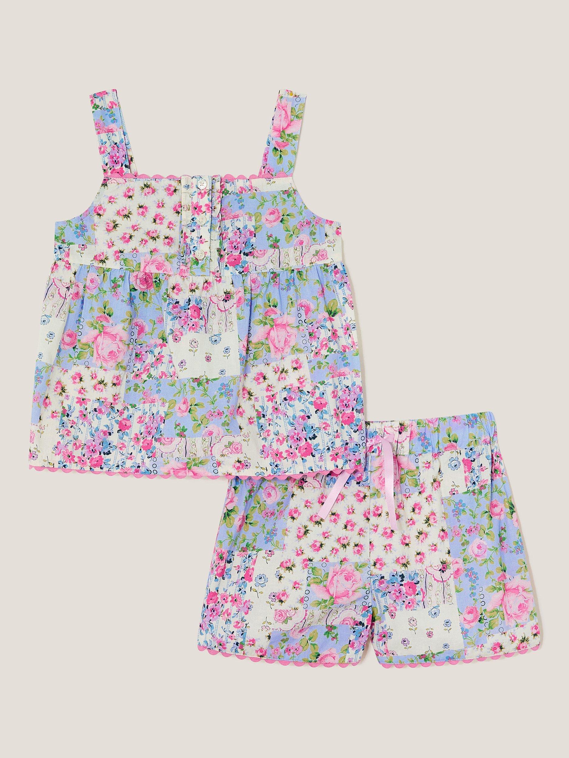 Sweet dreams. Made from soft cotton, this PJ set includes a cami top and shorts, both patterned with a patchwork of florals in a mix of pink and purple colours.