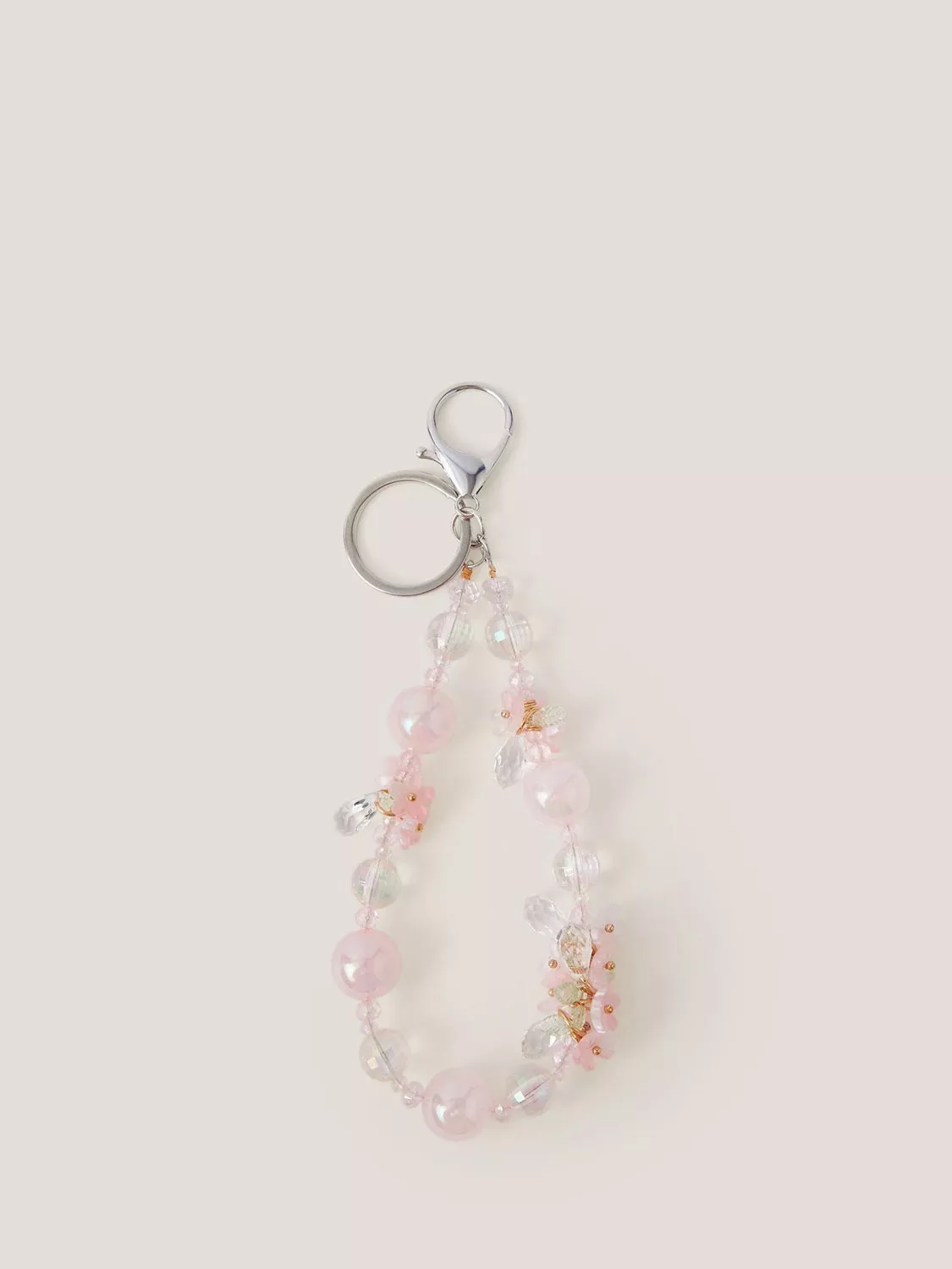 Strung with chunky beads and flower embellishments in pretty pink colours, this bag charm makes a cute addition to their backpack or keys. Attaches with the key ring or dog clip fastening.