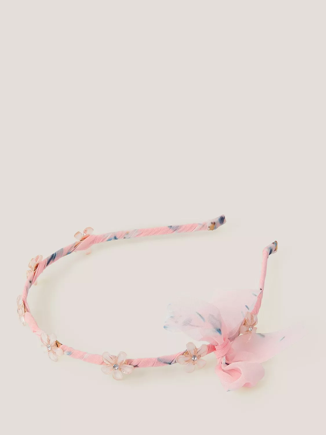 For those who love a pretty detail, wrapped with pink printed fabric that's tied off with a bow, this headband has resin flower embellishments with diamante centres.