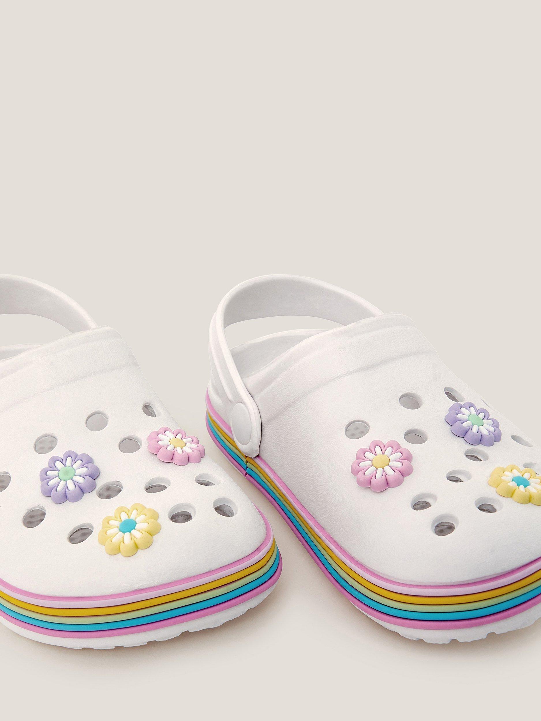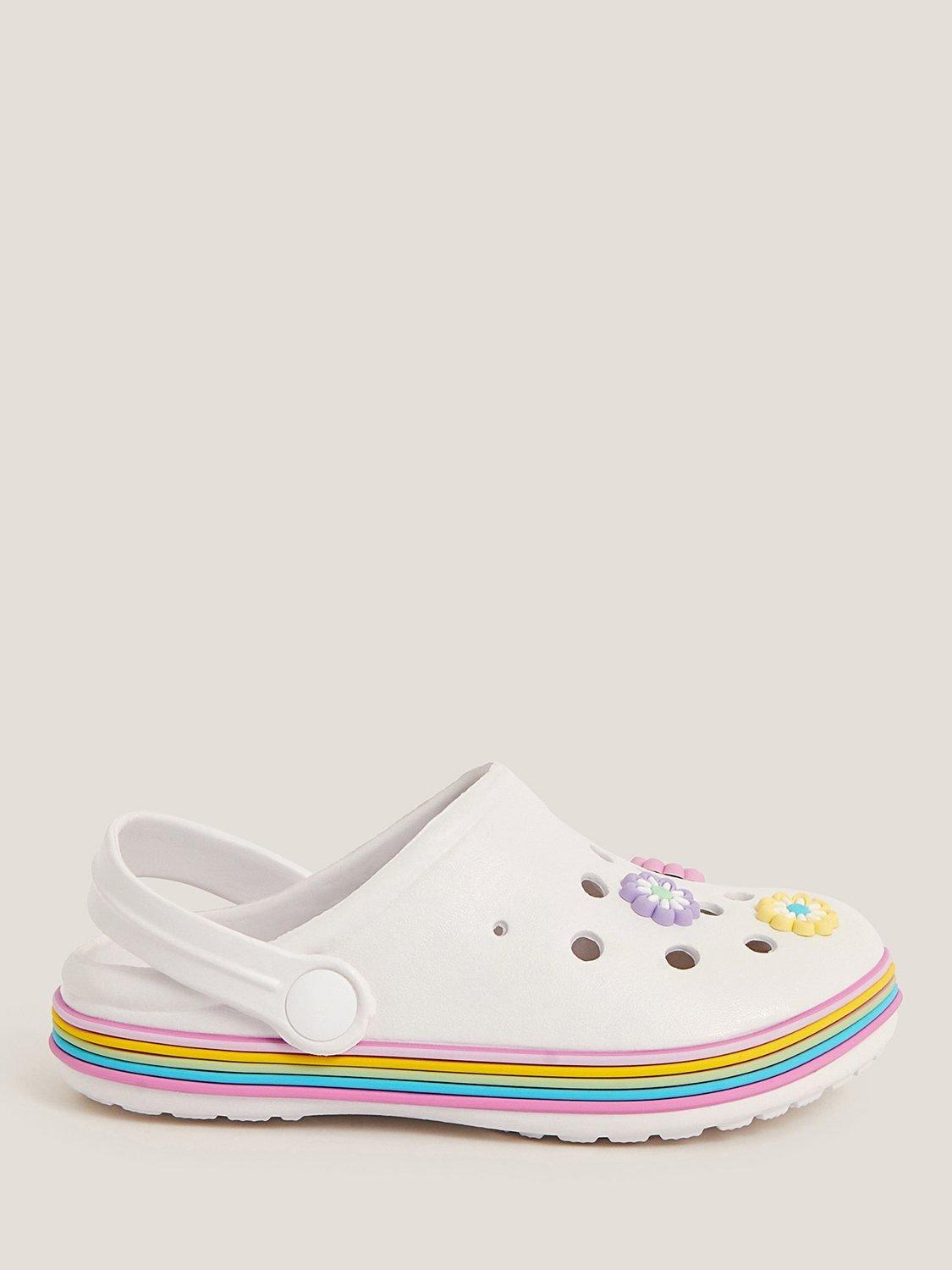 A treat for their feet. Designed in comfy and air-light material, these clogs are decorated with flower charms and pastel stripes. Secures round the back of the foot with a strap.