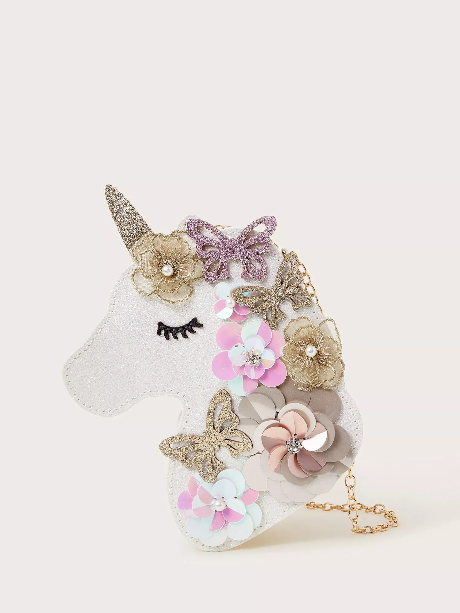 Boasting a unicorn-shaped profile covered in shimmery glitter, this magical bag is decorated with glittery butterflies and sequin flower embellishments. Finished with a zip fastening and gold-tone chain strap.