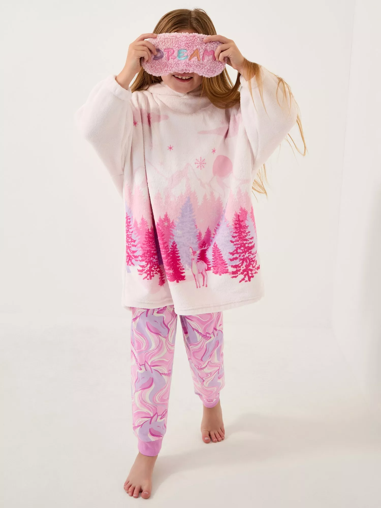 Doused in a pastel hue, this hoodie is decorated with a sweet forest scene, snow-capped mountains and falling snowflakes. Finished with 3/4 sleeves.