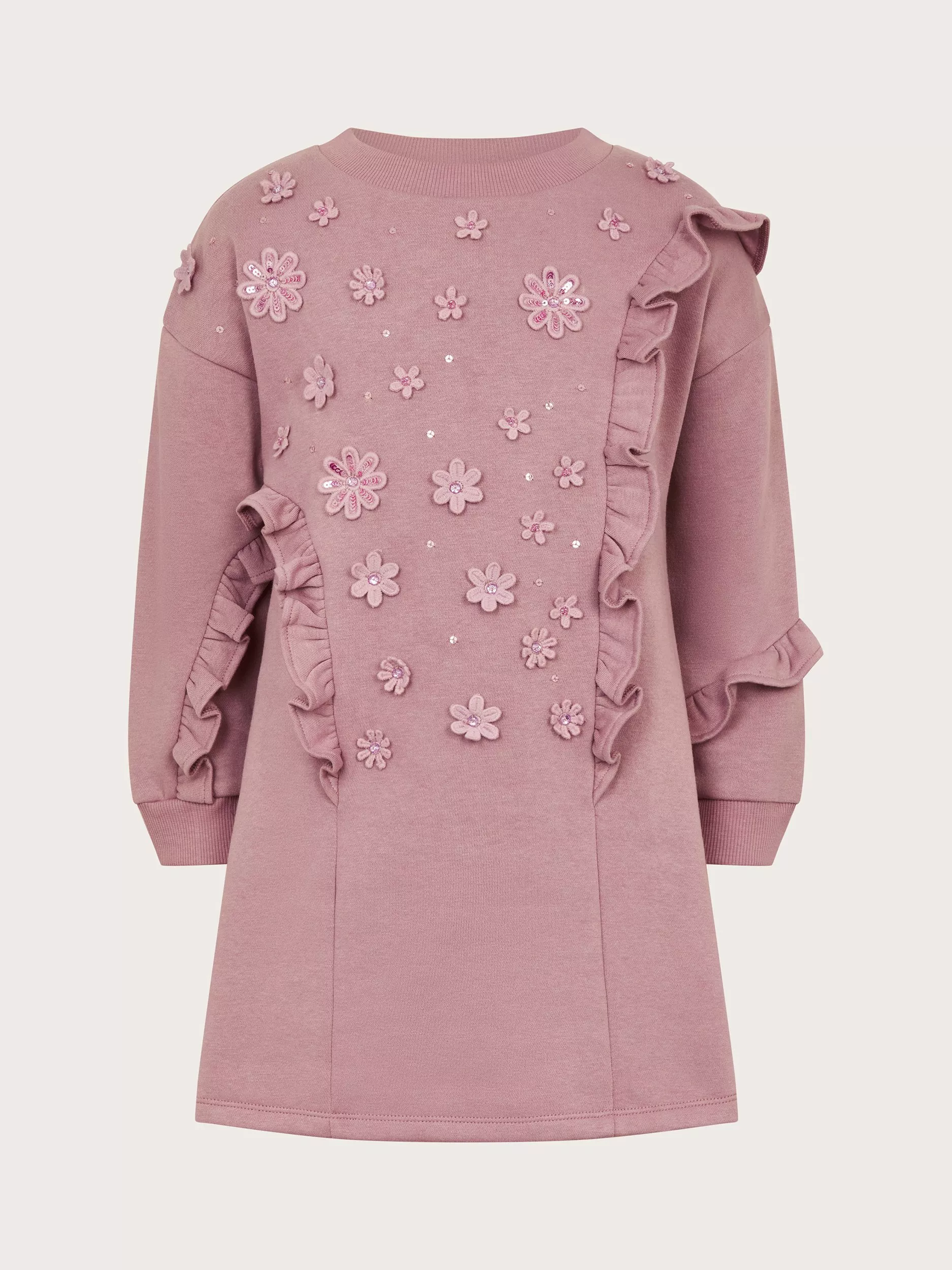 A comfy sweatshirt style dress that they can wear over tights or leggings. It's decorated with a trail of ruffles and 3D embroidered flowers with sparkly sequins.