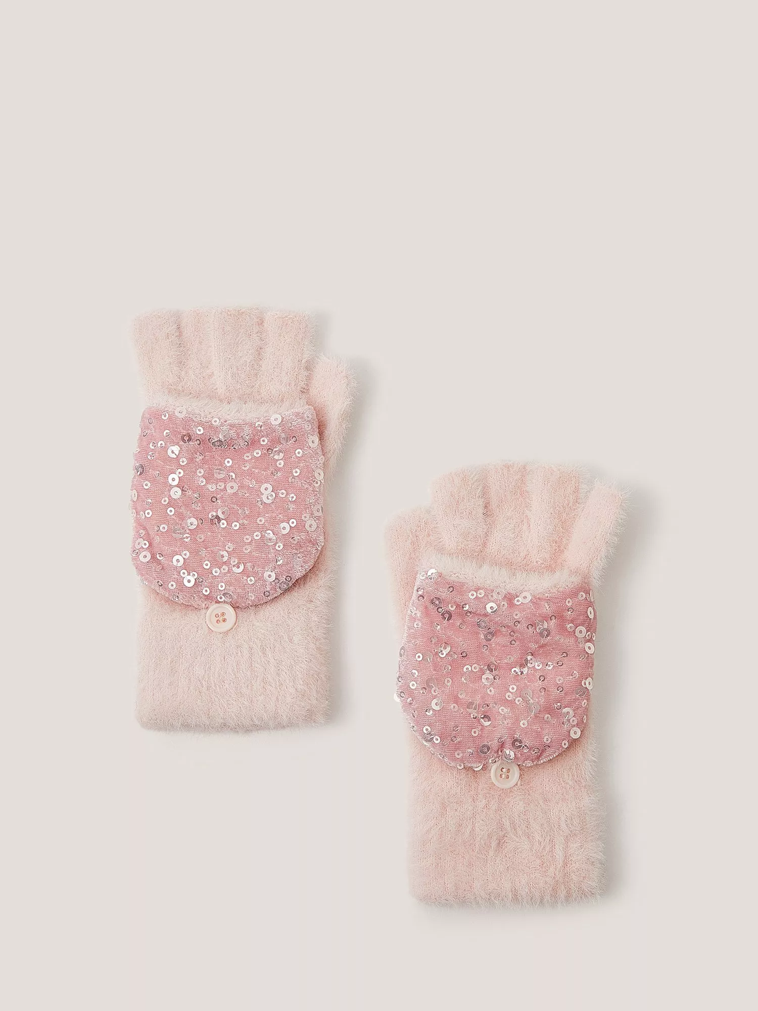 These fluffy gloves feature a capped mitten so you can switch them up from fingerless gloves. Finished with shimmery sequins.