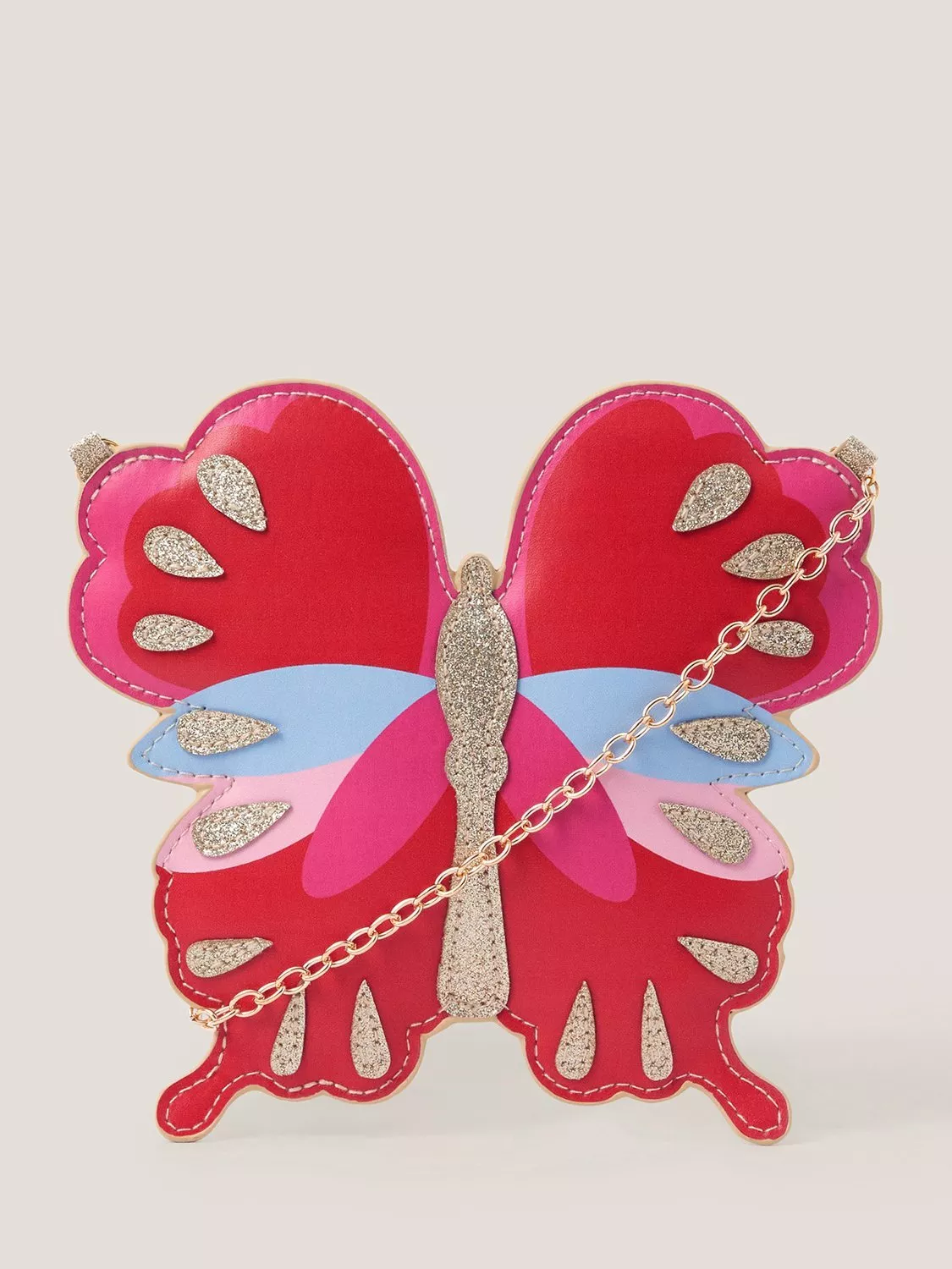 Shaped like a butterfly in bold, bright colours and glittery finishes, this crossbody bag will make all their weekend looks flourish. Finished with a small zip compartment and gold-tone chain strap.