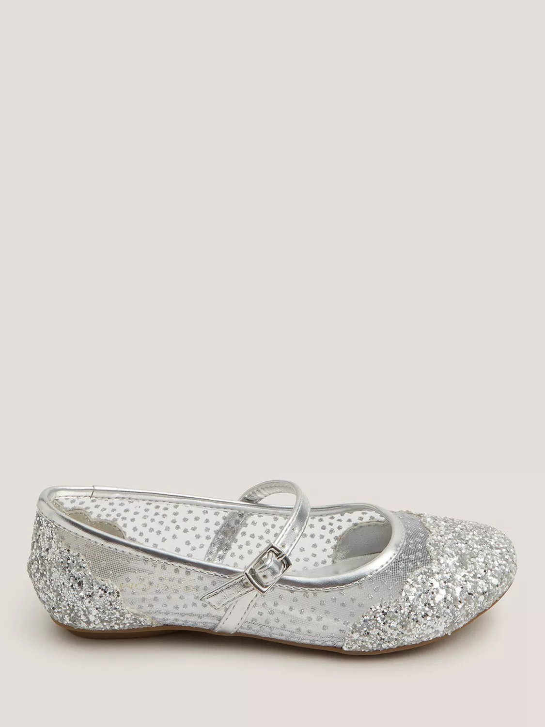 Designed in a silver metallic finish and doused in glitter, these ballet flats are the perfect finisher to all their party and occasion looks. Fastens with a buckle strap.