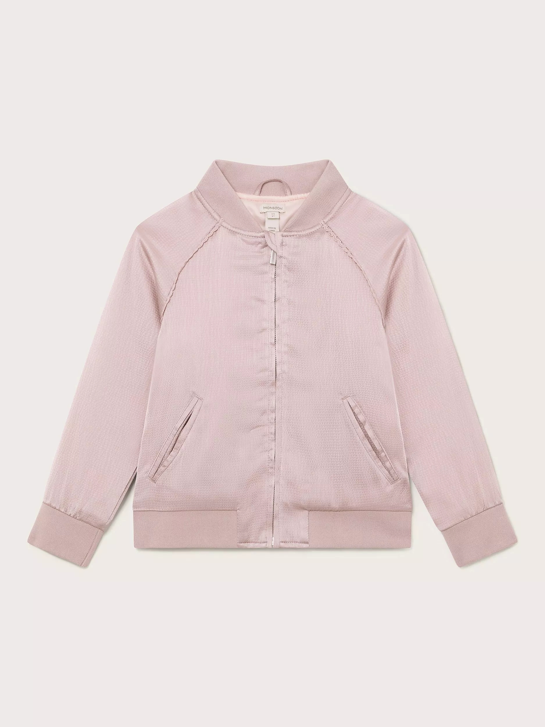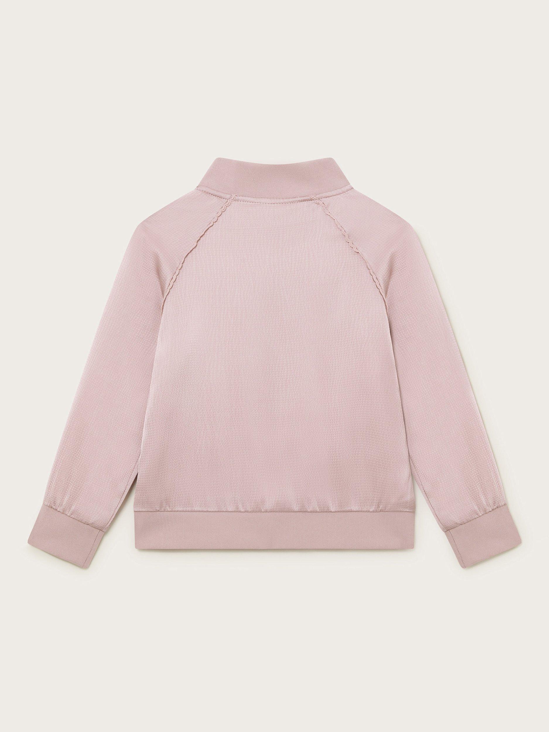 This casual bomber jacket makes a great layer when the weather starts to cool down. Made from satin with a subtle sheen and designed with side pockets and fitted cuffs.