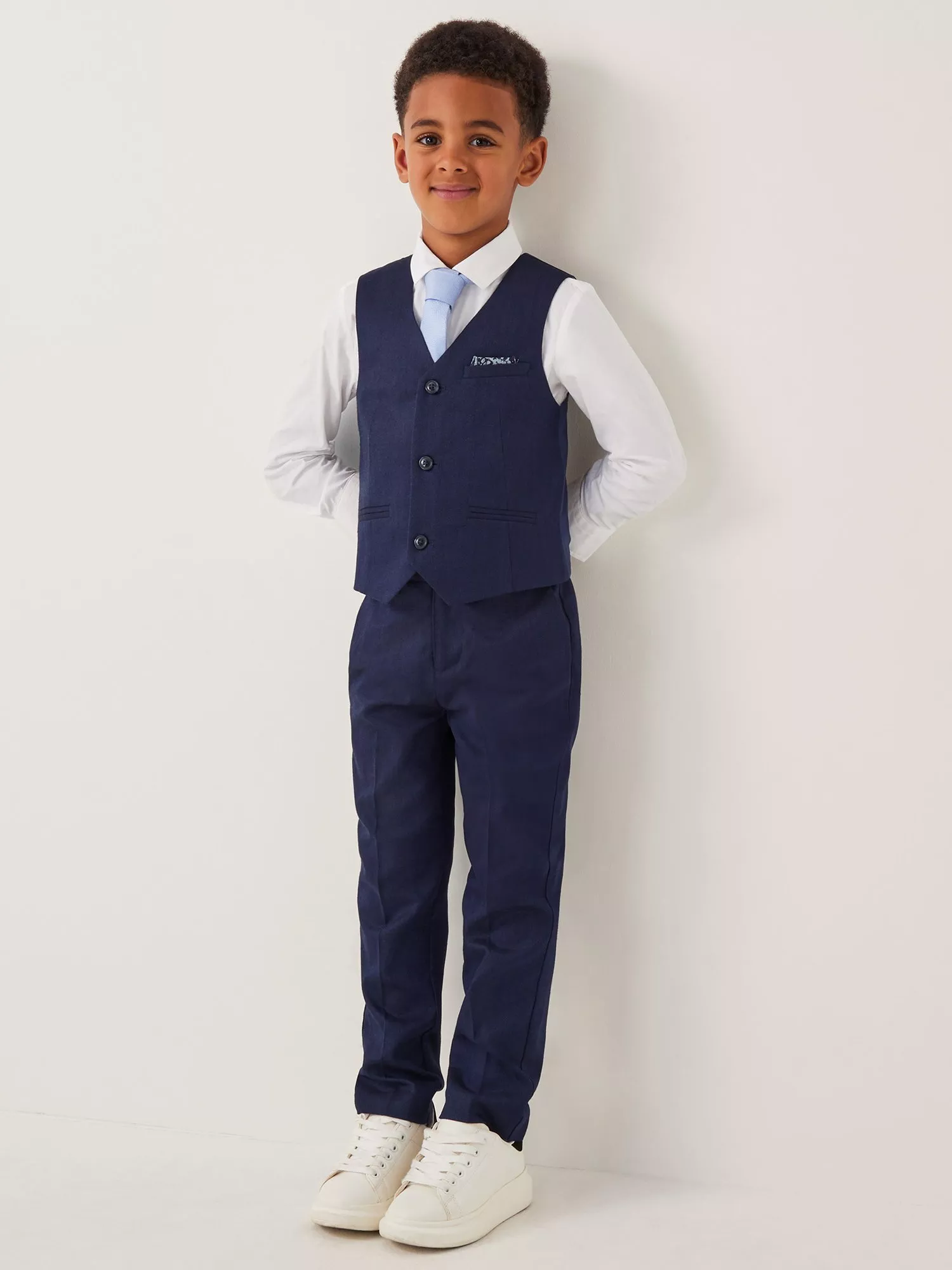 Featuring a plain shirt, baby blue tie, navy waistcoat and matching trousers, this suit is a top pick for any special occasion. Showcasing a herringbone finish, the waistcoat is topped with a patterned pocket square in the chest pocket to complete the look.