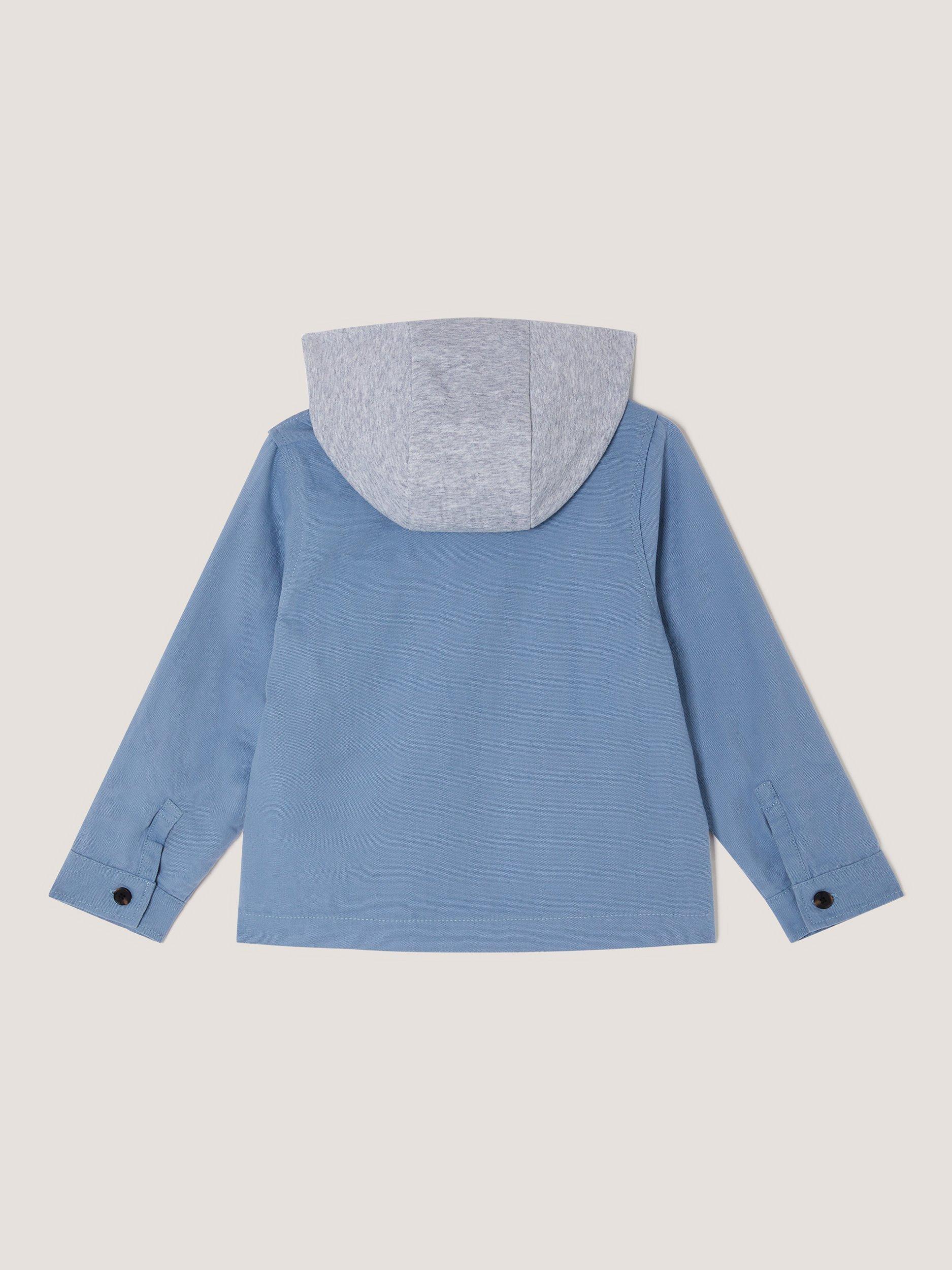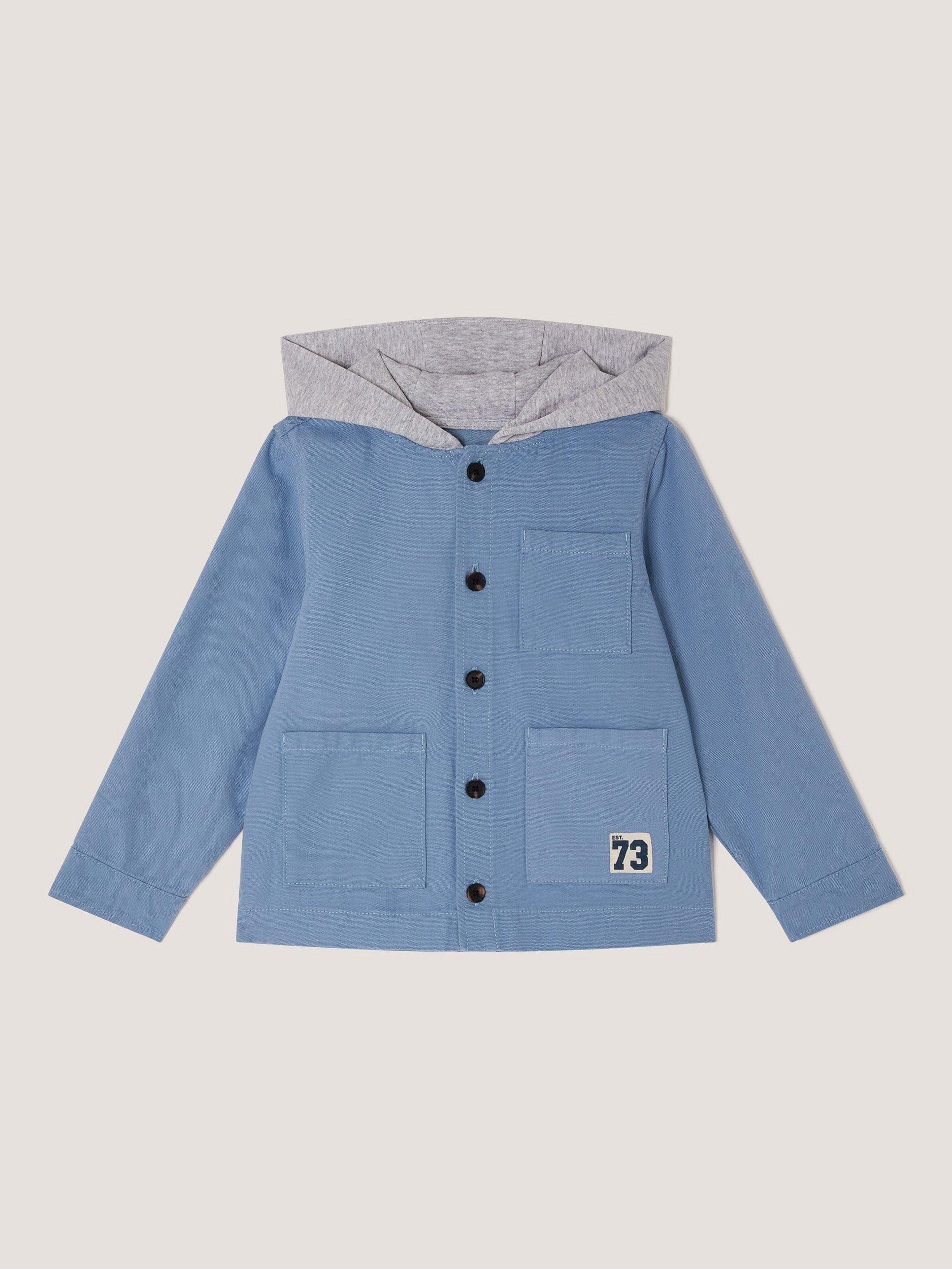 Designed in dusty blue, this chore jacket features three patch pockets, front button fastenings and a grey built-in hood. An ideal layer for between-season styling.