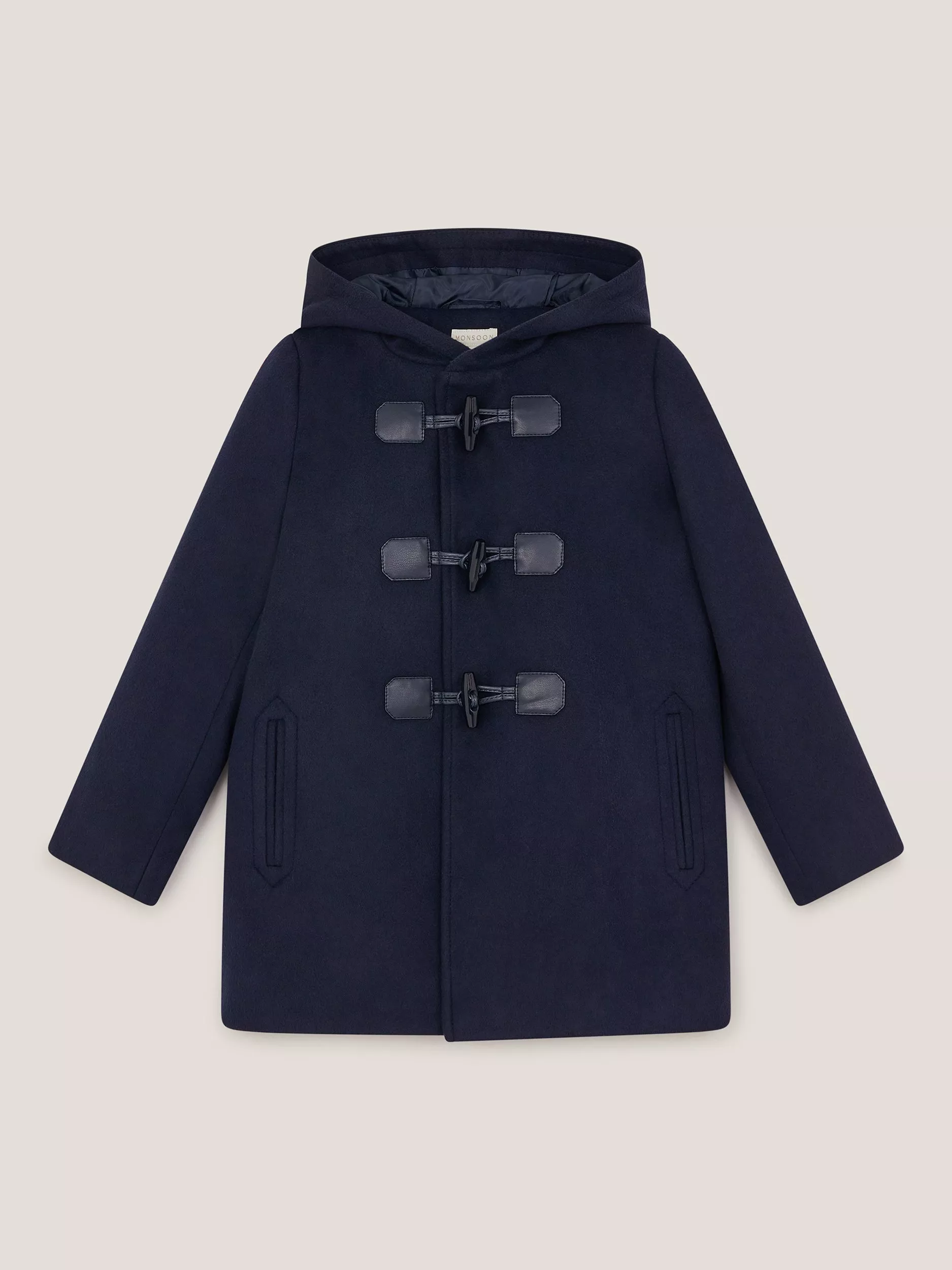 Wrap them up in this traditional duffle coat from Monsoon, crafted form a textured wool-effect fabric, and designed with a fixed hood, classic toggle fastening and side pockets.