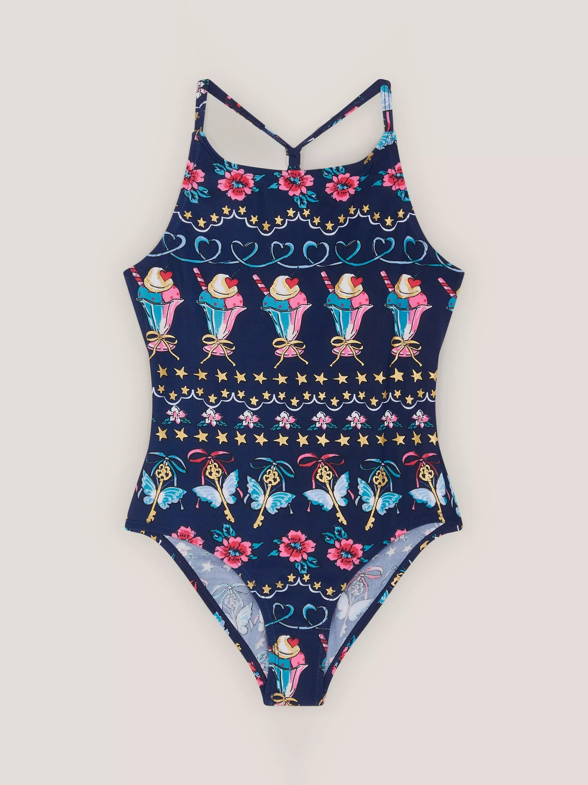This swimsuit is patterned with rows of flowers, stars, hearts and ice cream sundaes over the navy blue backdrop.