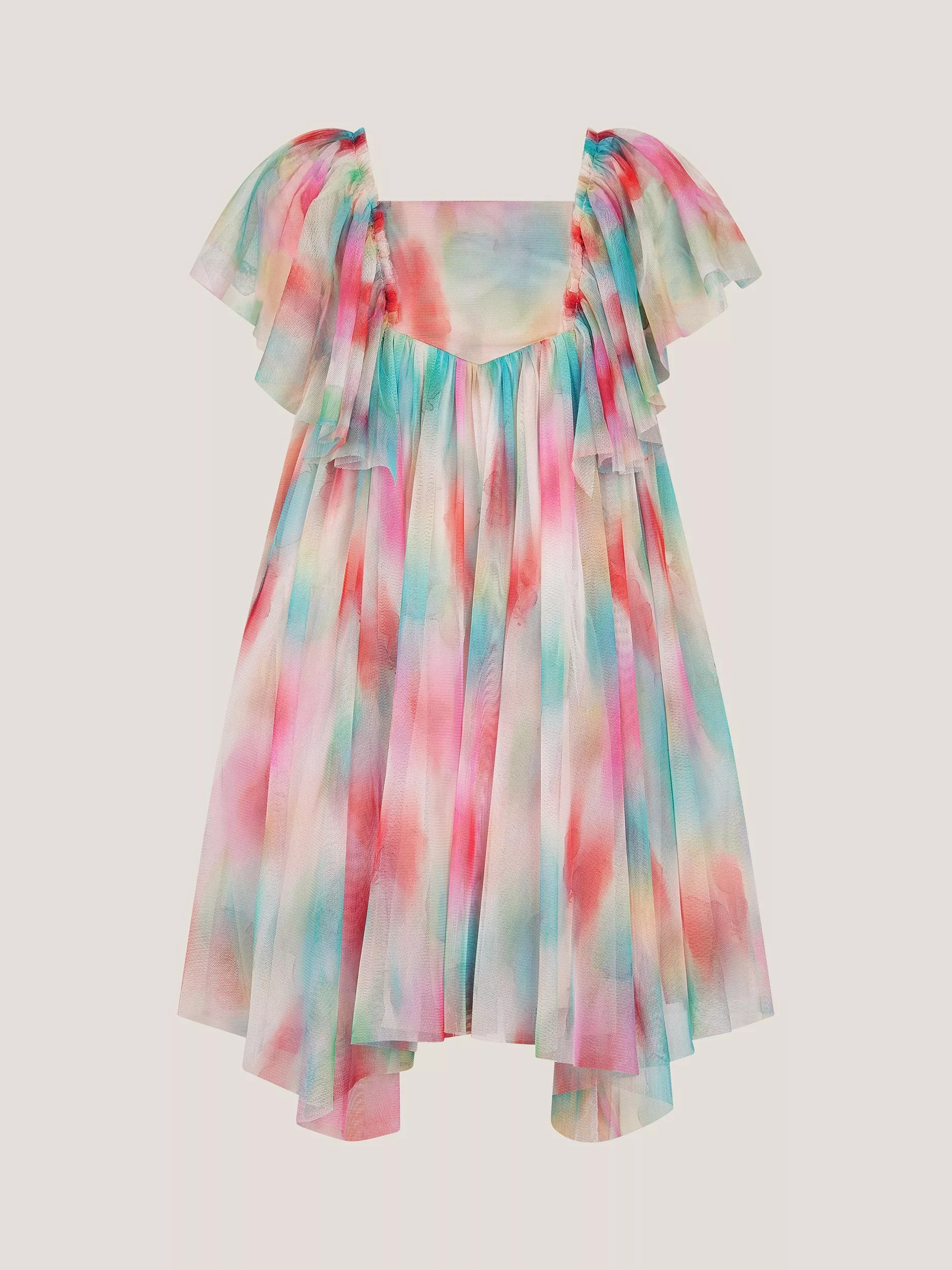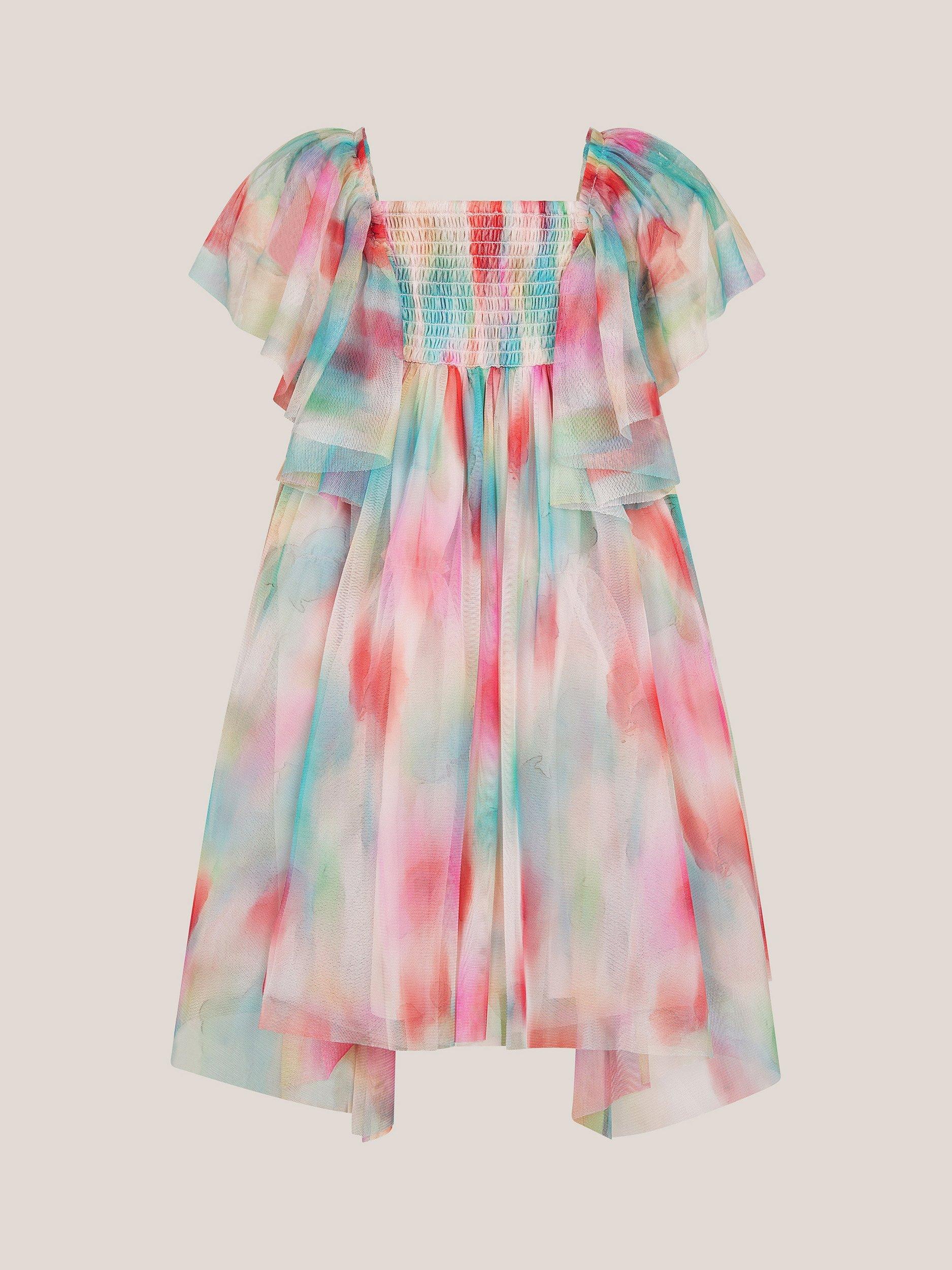 I can sing a rainbow... Blooming with a super-colourful Irate print, this dress boasts a twirl-worthy hanky hemline with fluttery sleeves and a shirred panel for extra comfort.