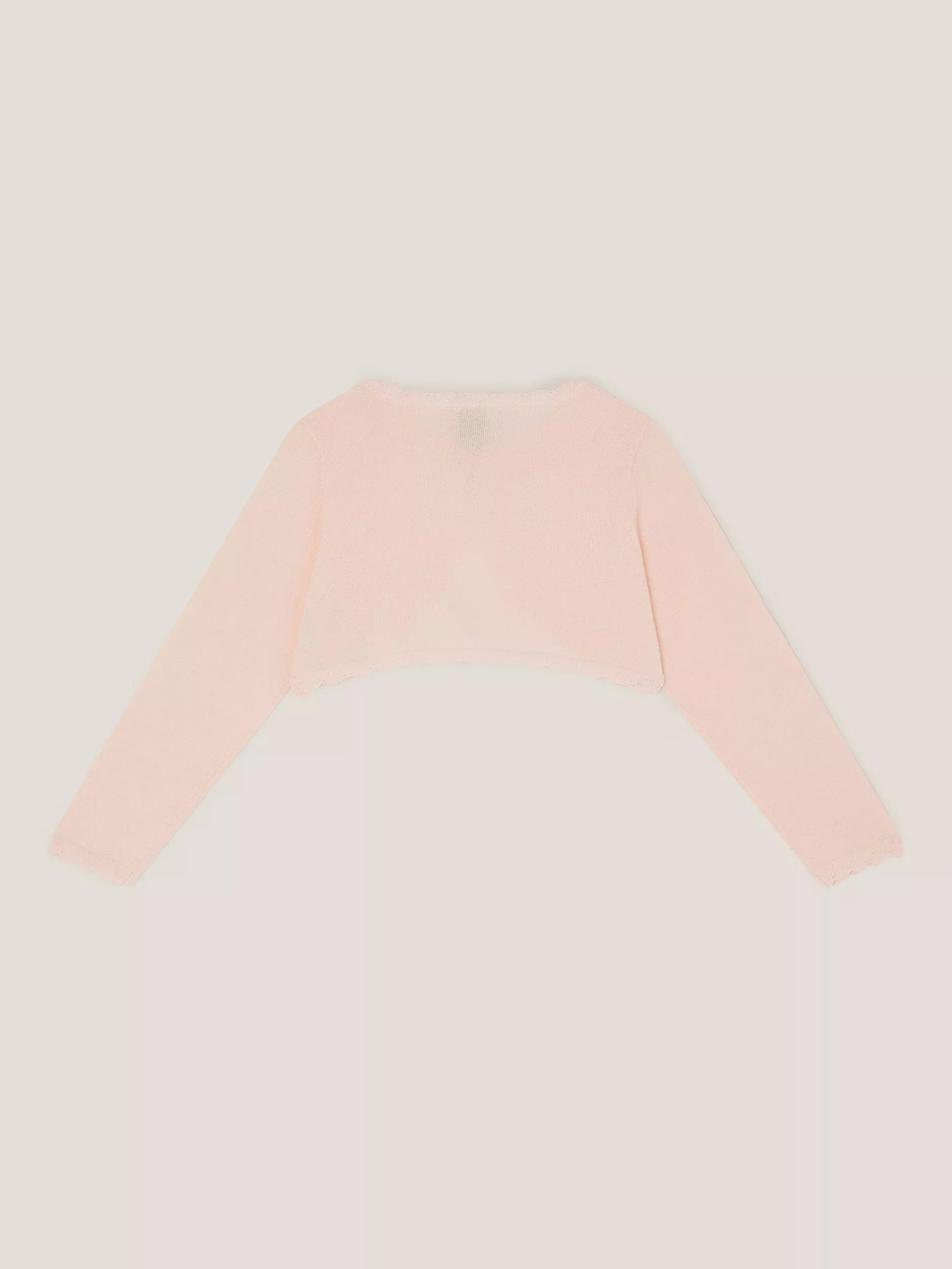Crafted from a soft, cotton-blend knit, this cardigan from Monsoon is designed with a round neck, scalloped trims and long sleeves. Finished with a sequin-embellished bow button fastening to the front.