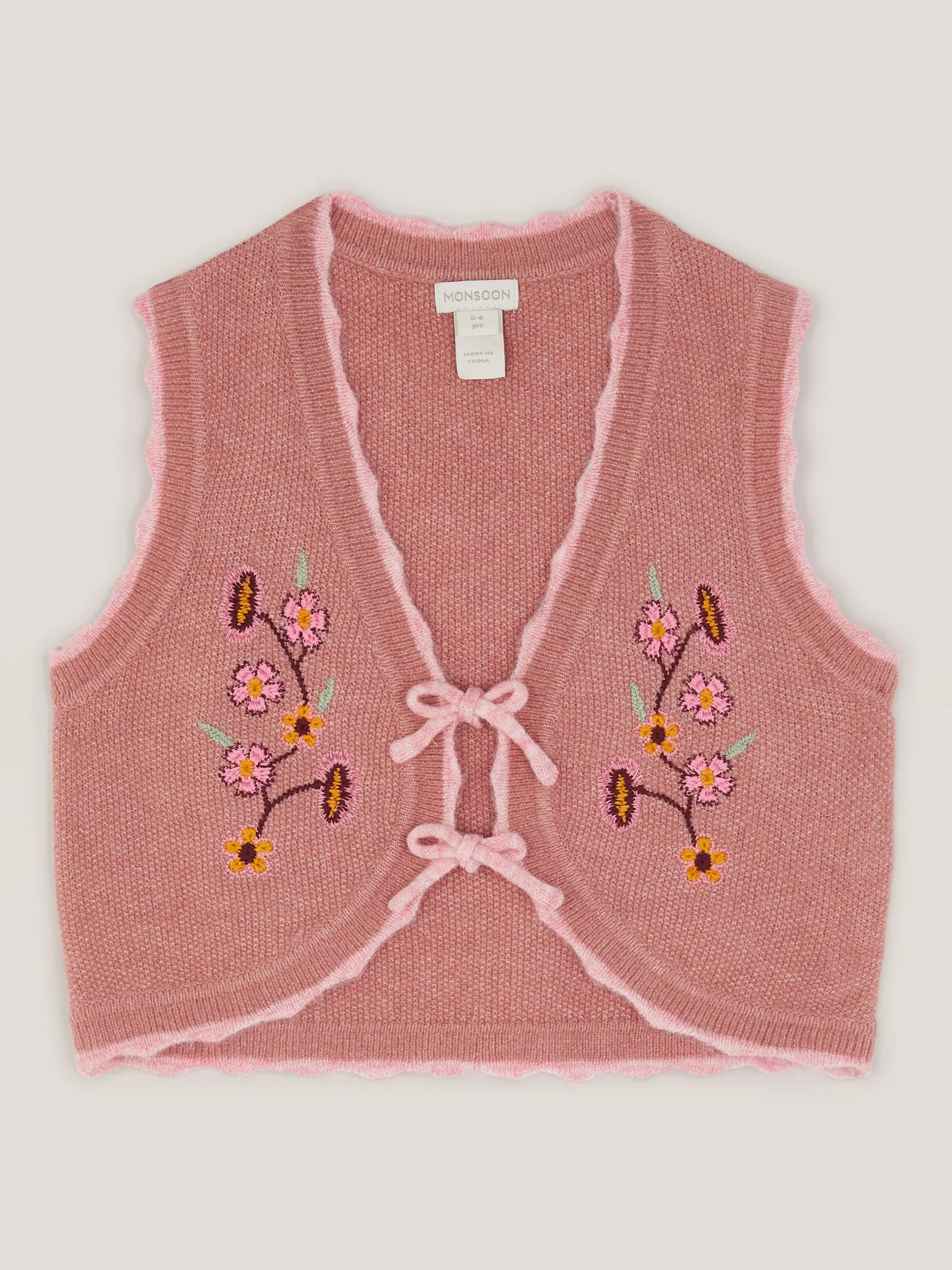 A retro style for the new generation, this waistcoat is knitted with super-soft yarns in a dusty and baby pink colour combo. Decorated with colourful floral embroidery through the front, it's finished with tie-up fastenings, leaving room to show off their tops and T-shirts underneath.