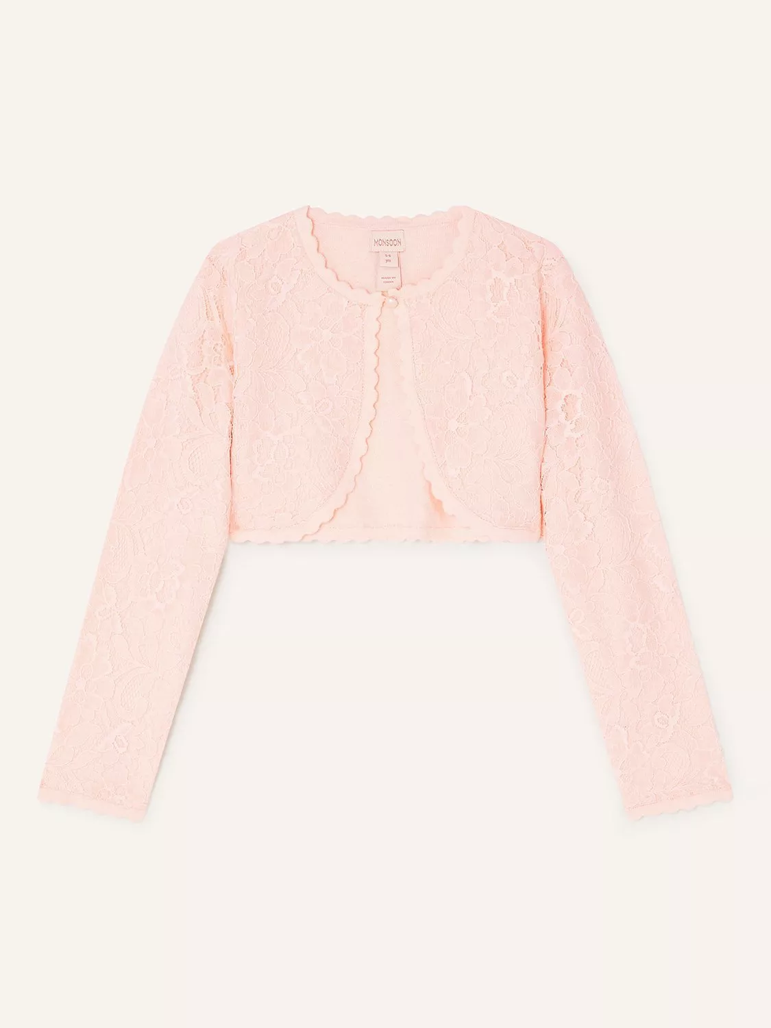 Perfect for layering over their summer dress, designed in delicate lace with a scallop trim.