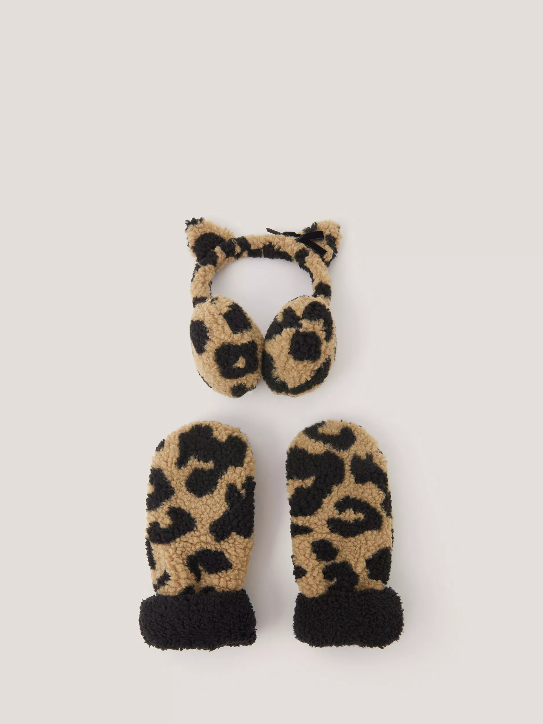 Coated in super-soft borg that'll see them through the chilliest of days, this earmuff and mitten set boasts a fun leopard print design.