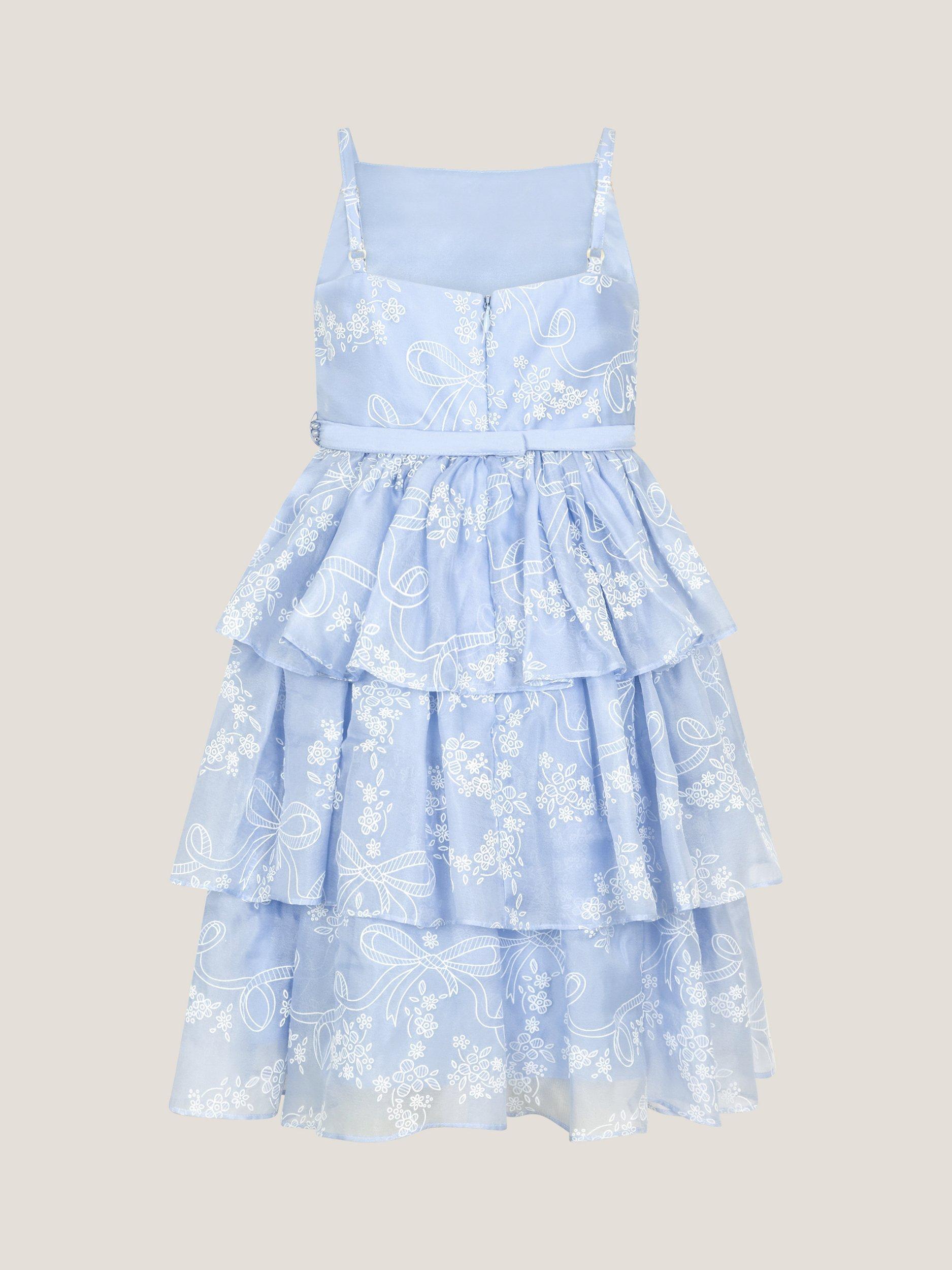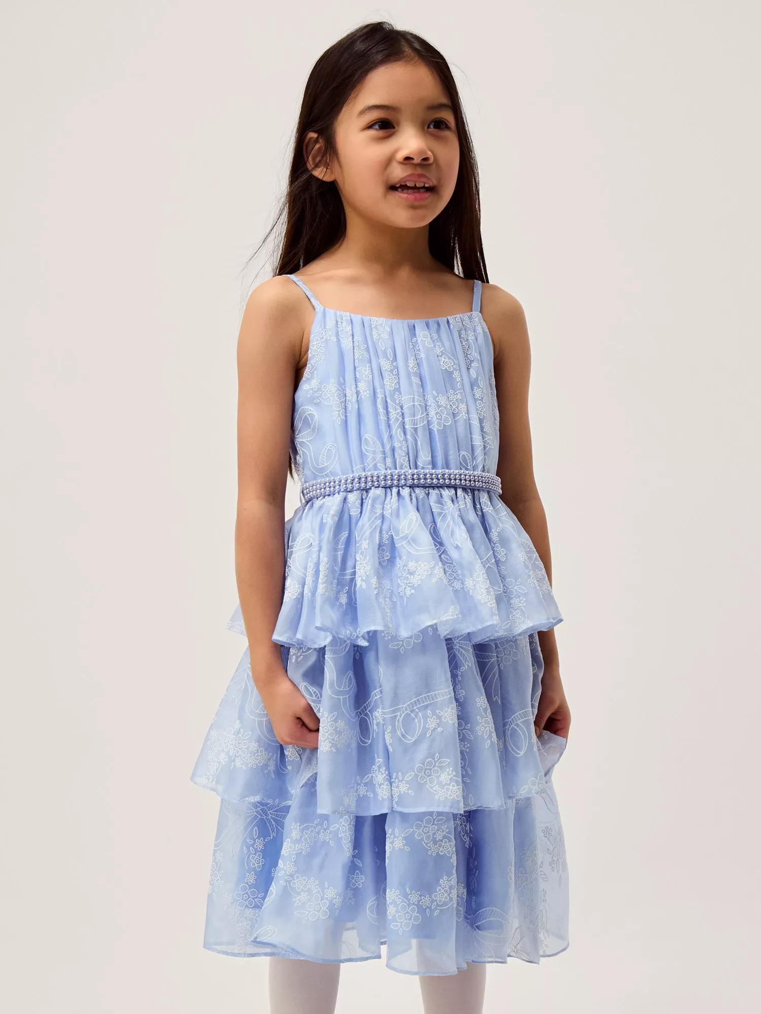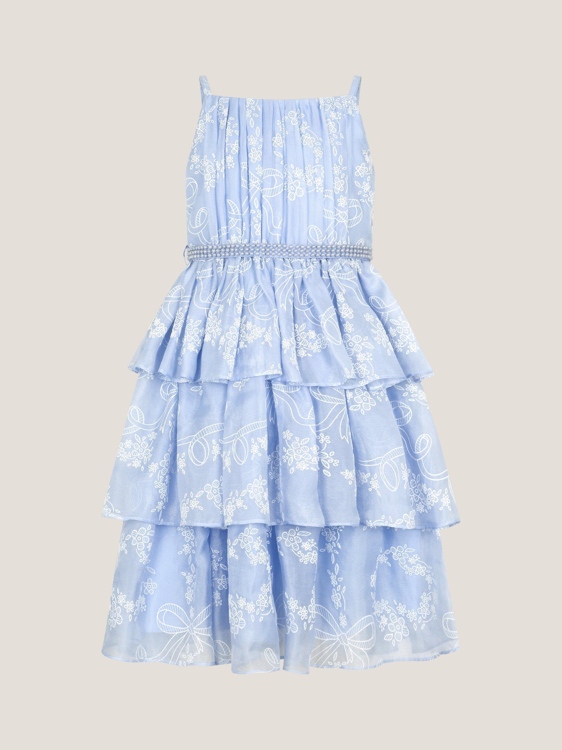 Perfectly twirly and printed with a contrast pattern, this dress features tiers of floaty fabric. Designed with a beaded pearly belt, it's a pretty pick for special days.