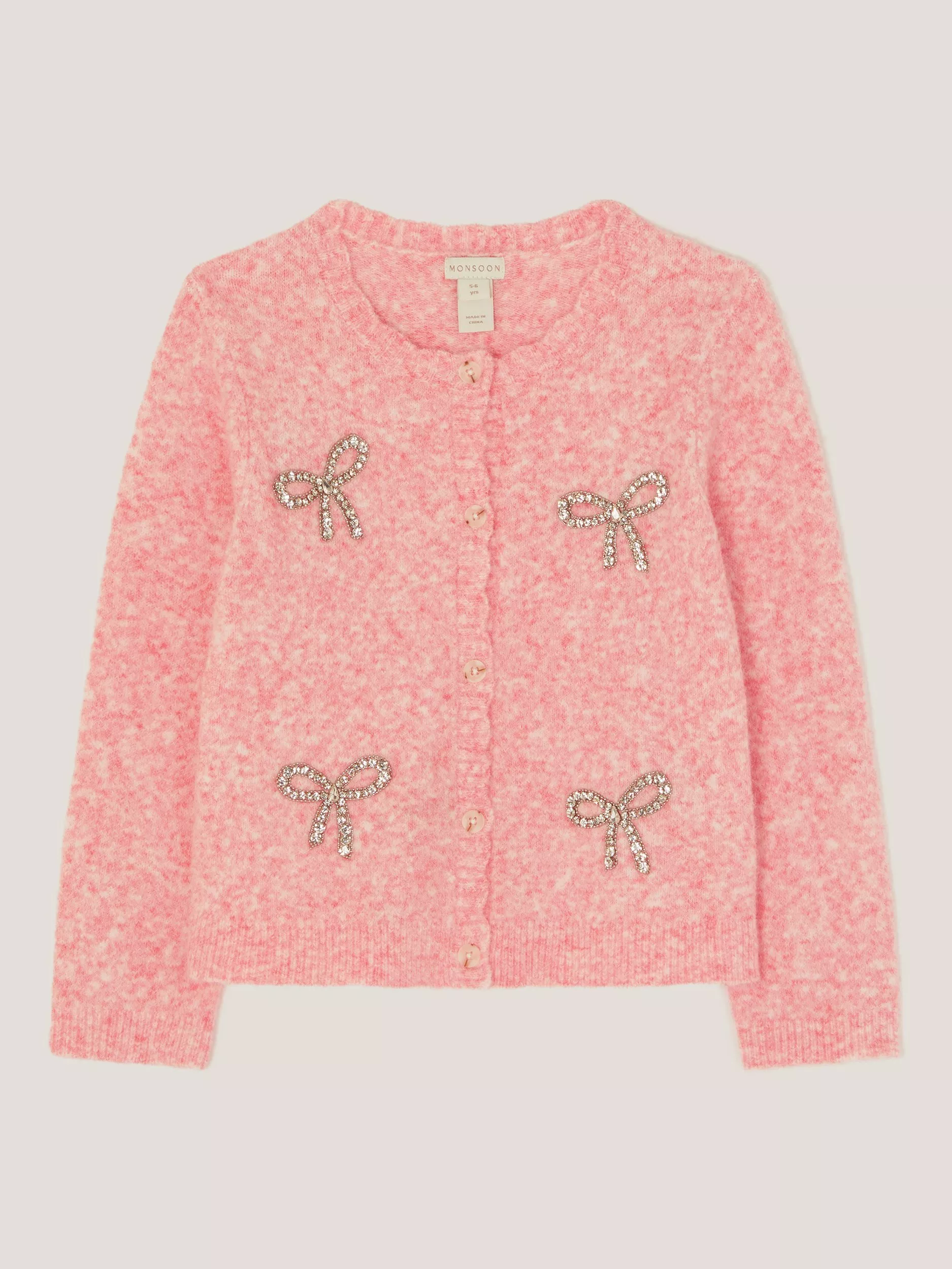 Designed to look as sweet as candyfloss, this long-sleeved cardigan is a dazzling addition to their knitwear collection. Decorated with diamante bows and a subtle scalloped neckline.