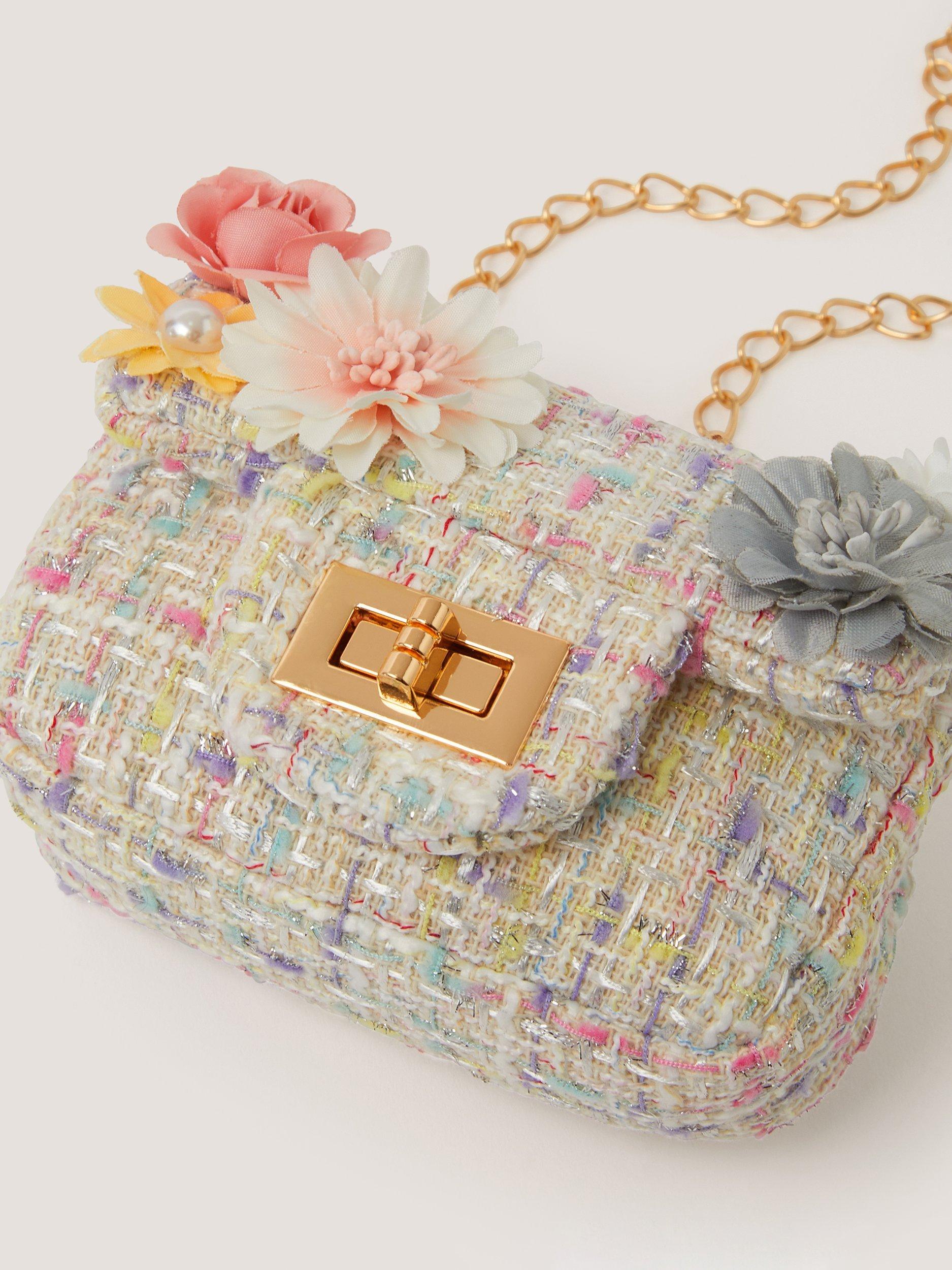 Little Miss Fashionista! Small in size but big in style, this bag is designed with colourful boucle fabric and fabric flower embellishments. Features a twist-lock fastening and long chain strap.