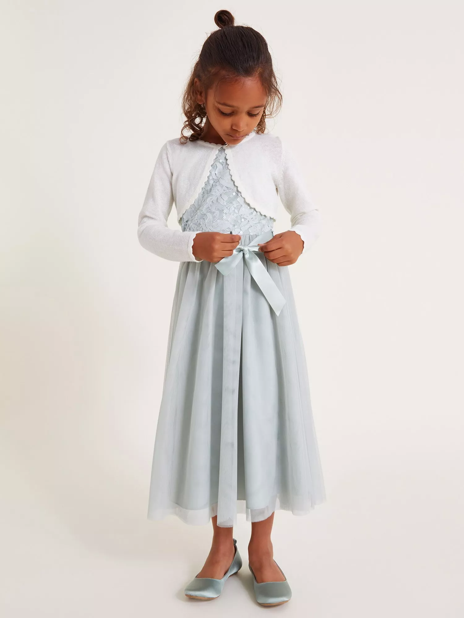 This bolero style cardigan has a diamante fastening and scalloped edges for a prettyb finish.