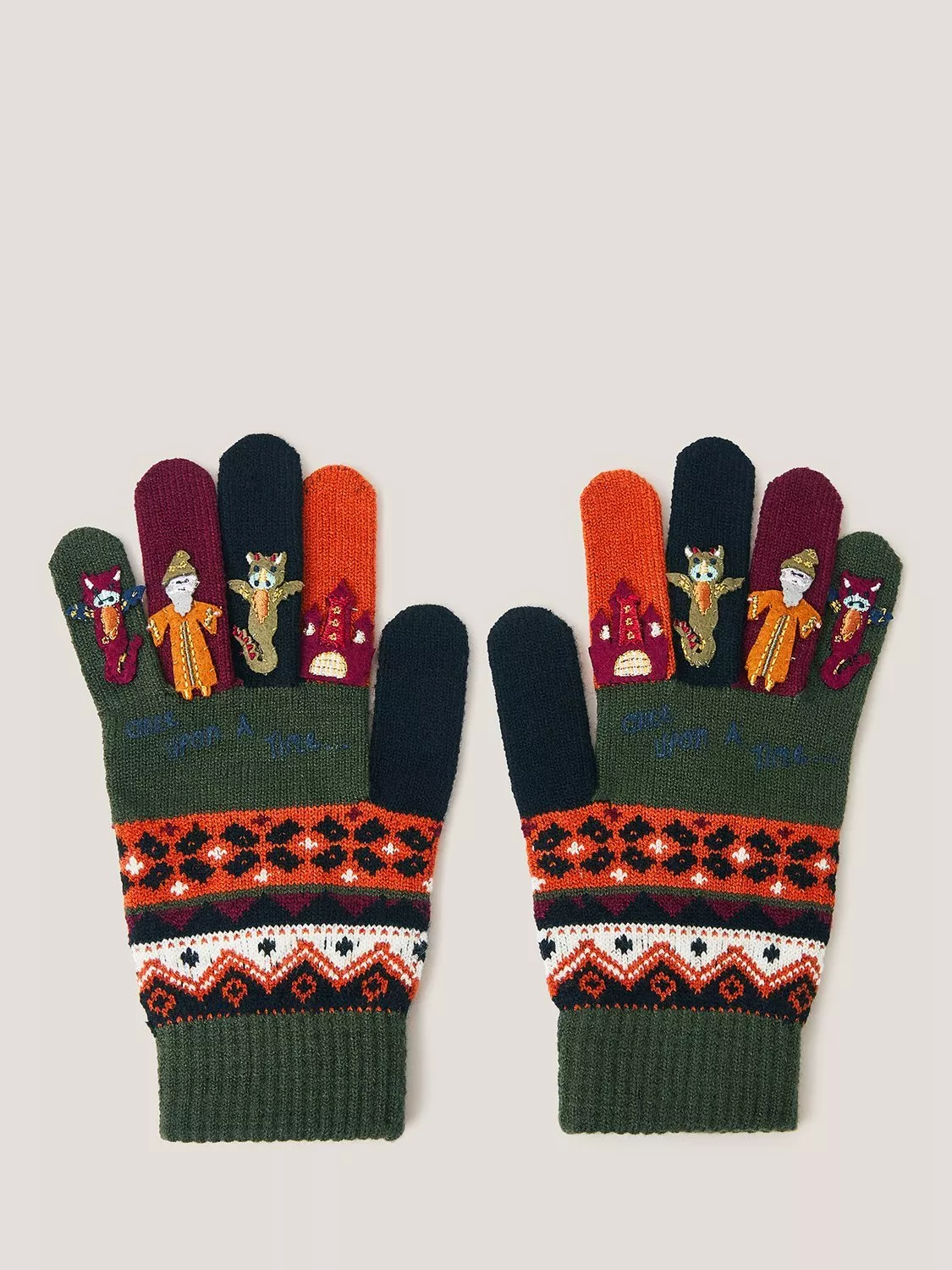 Stitched with a fair isle pattern in green, black, burgundy and orange, these winter warmers feature castles, fire-breathing dragons and wizards embroidered on the fingers.