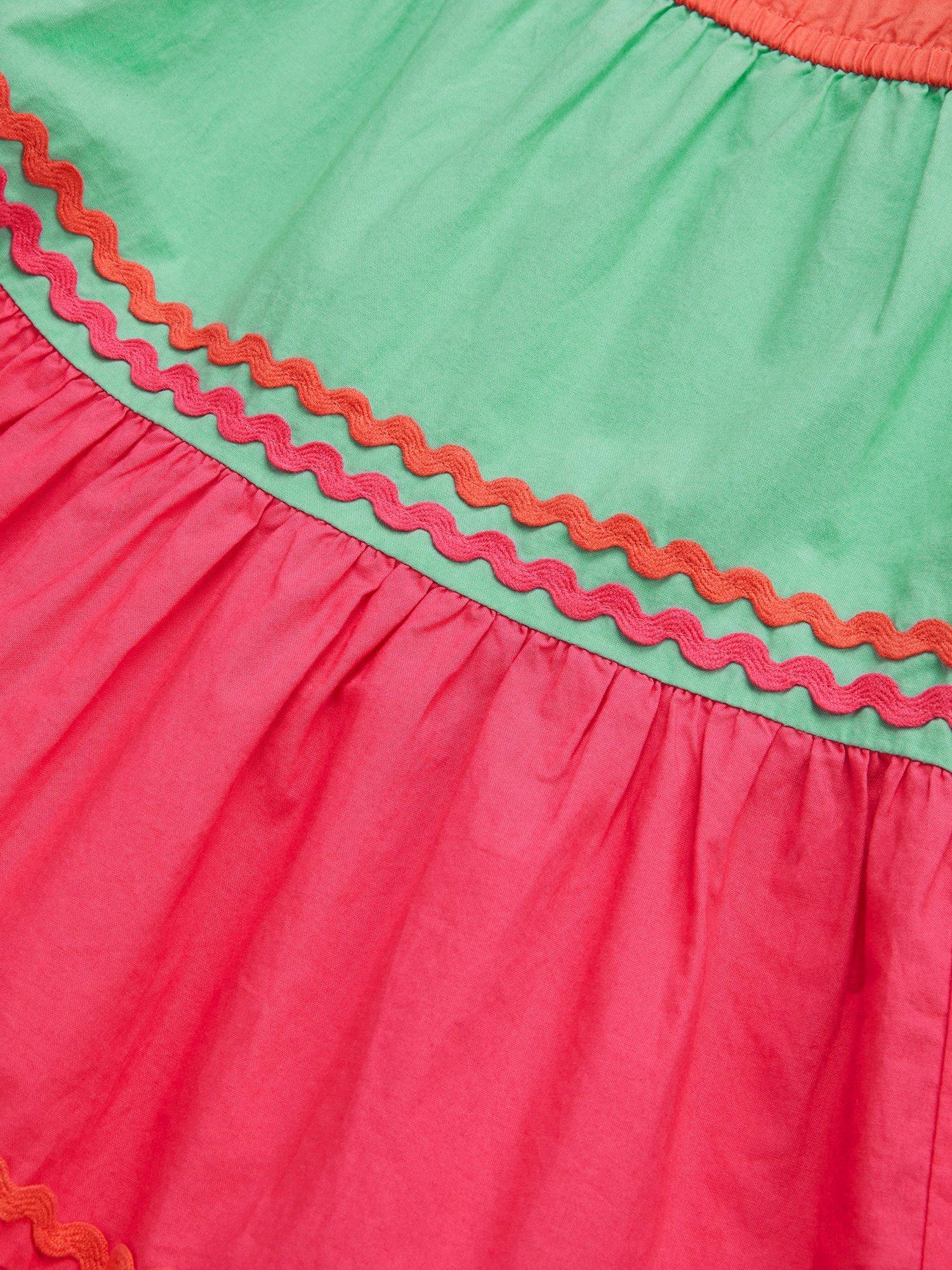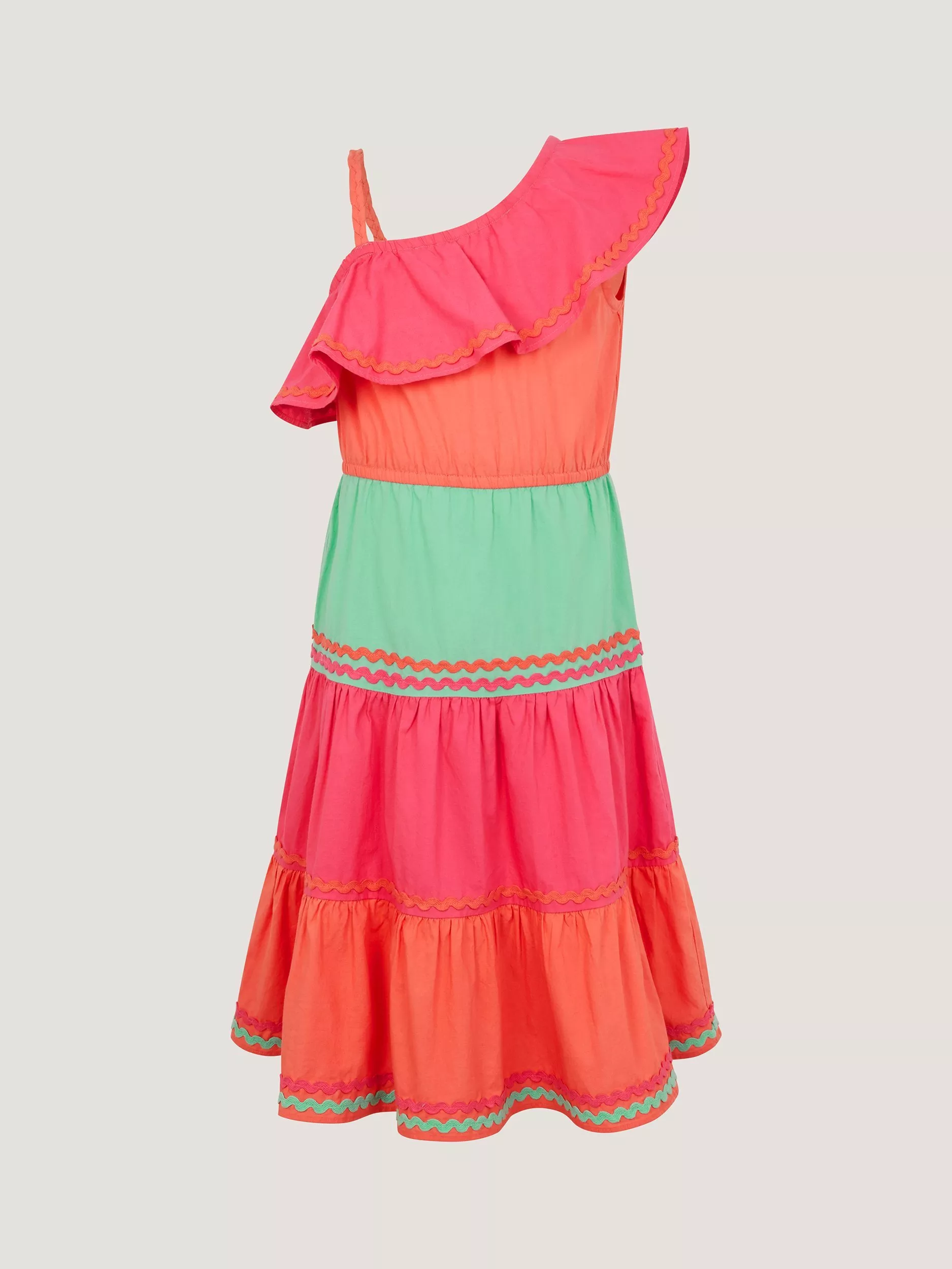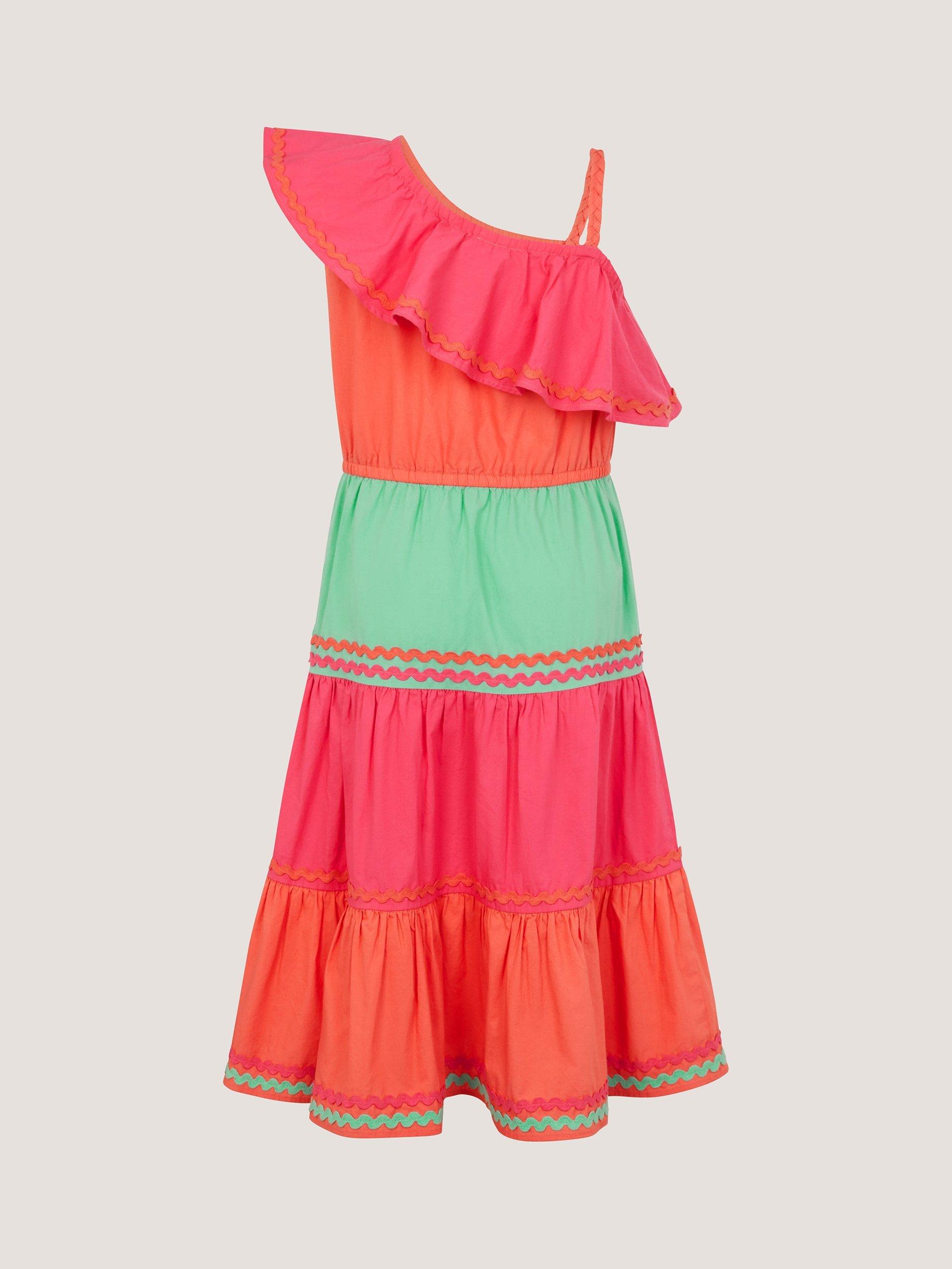 Made with breathable cotton fabric in raspberry, peach and mint colours, this dress features a one-shoulder strap and statement ruffle at the neckline for a playful finish.