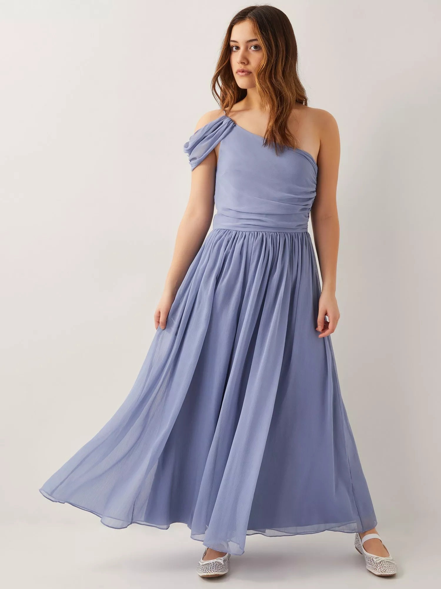 Layered with floaty chiffon, this dress is designed with a cute, one-shoulder, gathered bodice before falling to a midi length with pleating detail in the skirt. With a simple draped sleeve for added glamour, it's perfect for special occasions.
